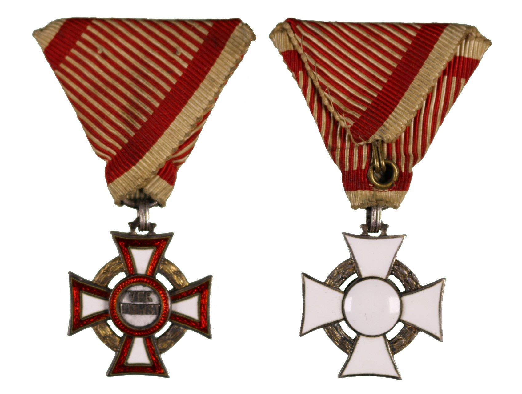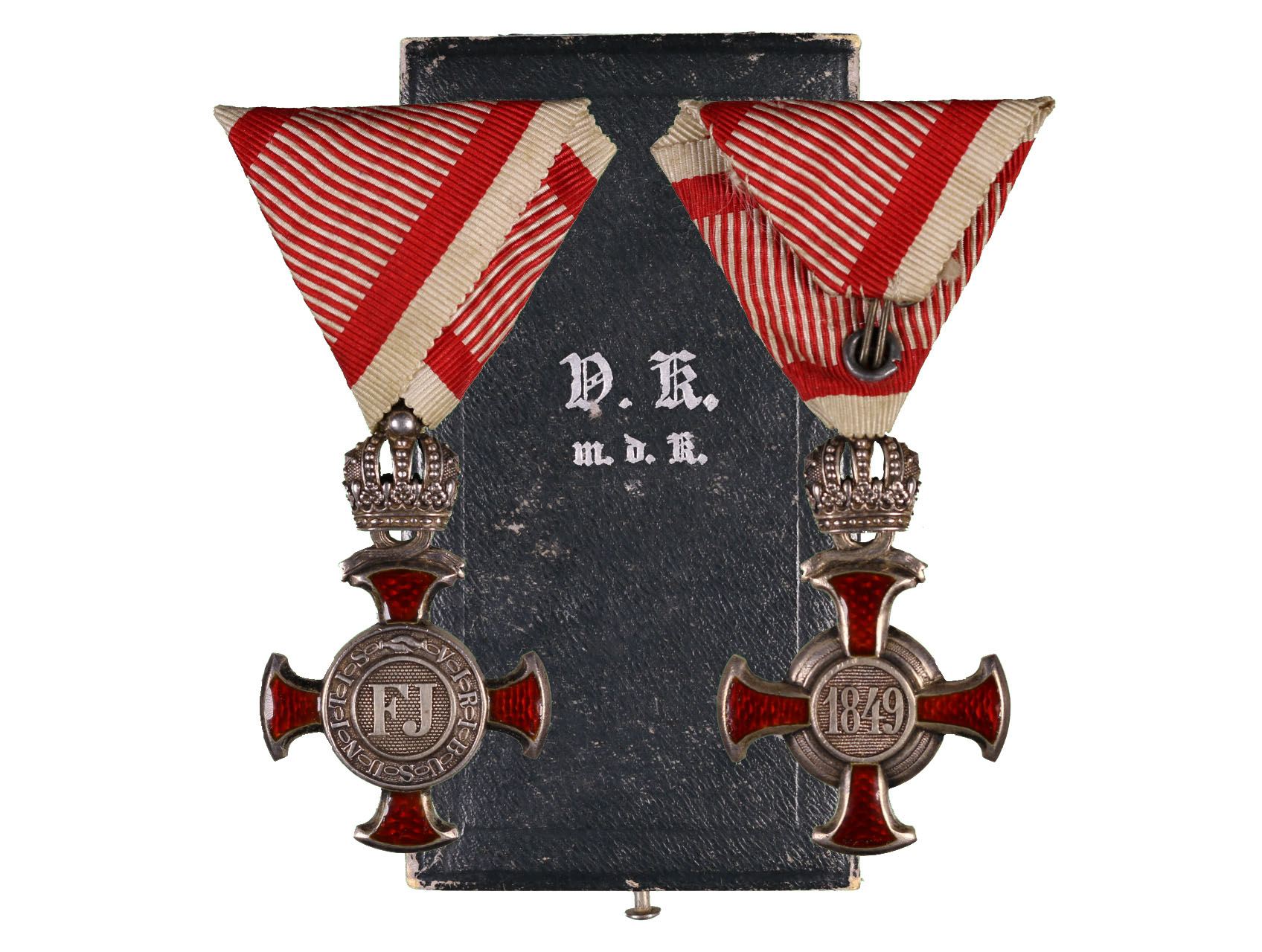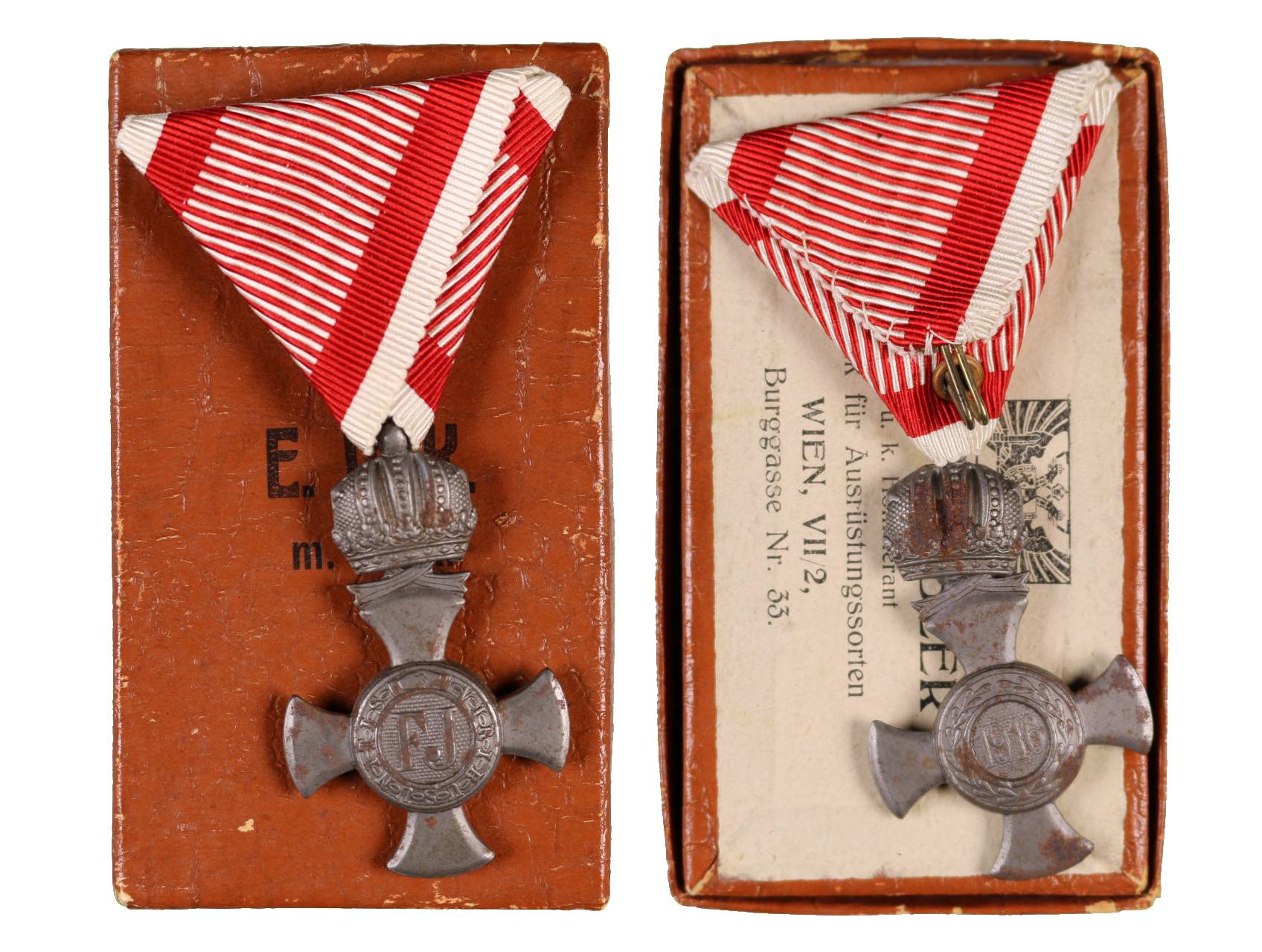 Stříbrný záslužný kříž s korunou (Ag), značen Vincent Mayer Wien, původní vojenská stuha, originální etue, Marko140c