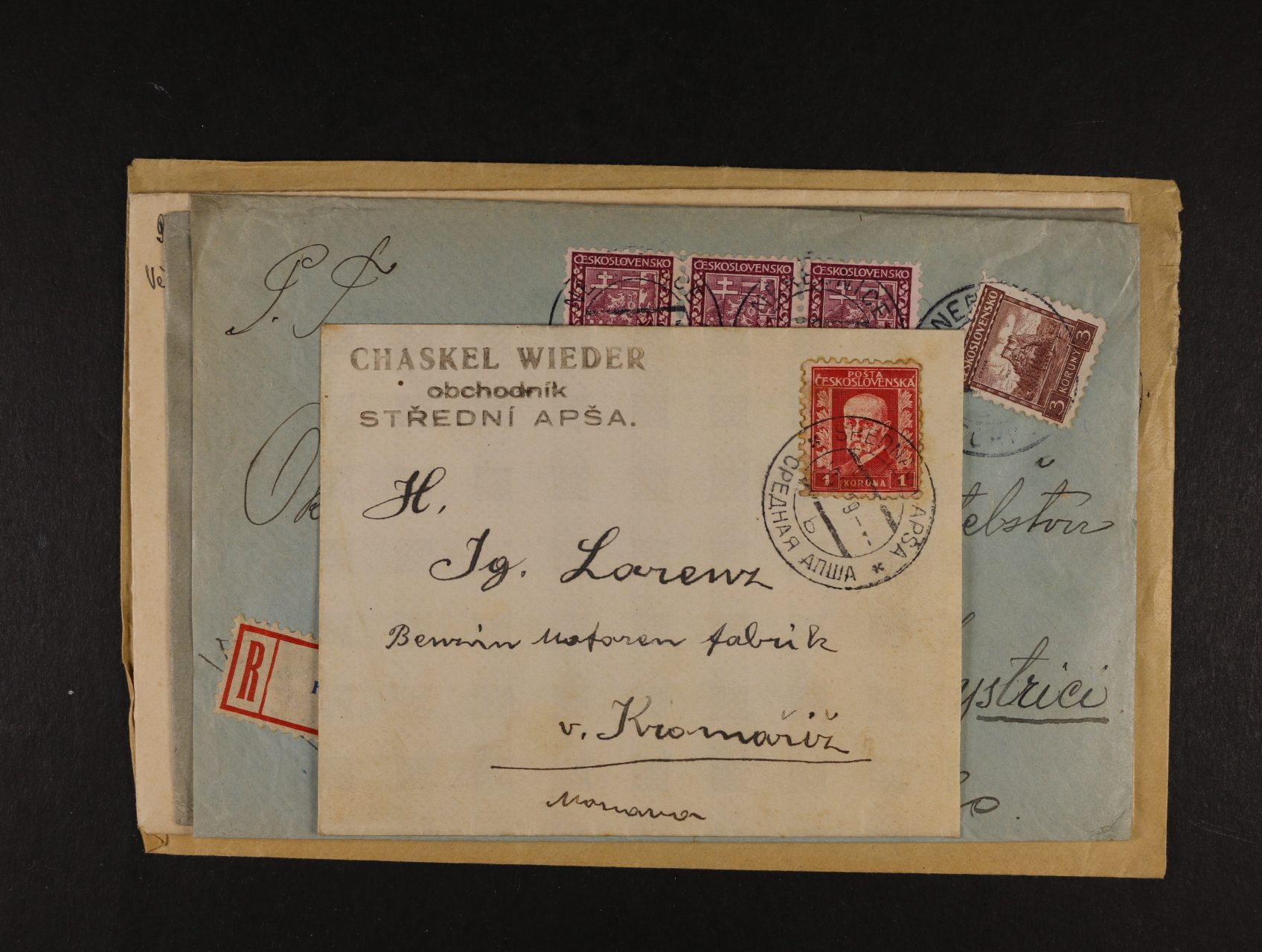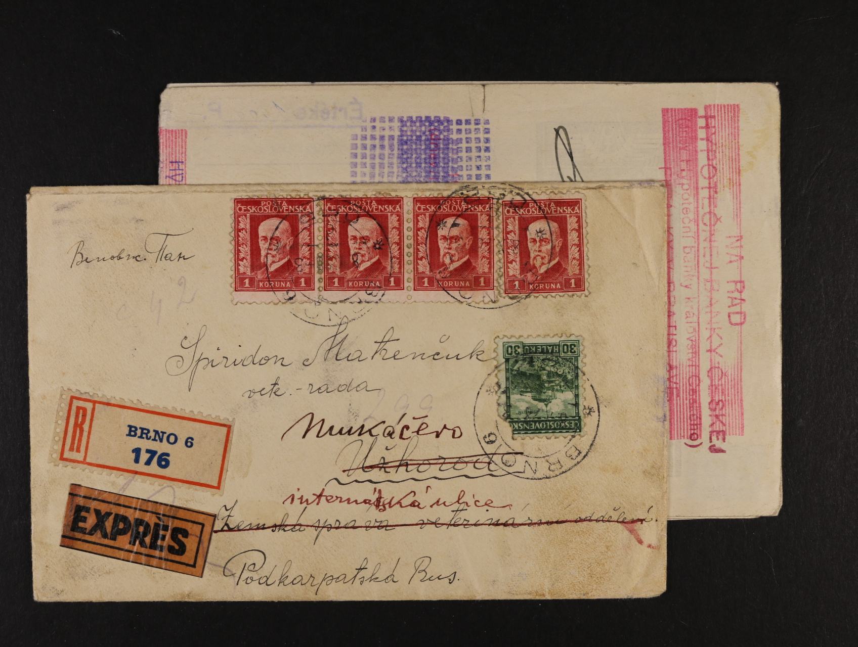 484 R-EXPRES dopis z Brna do Užhorodu, doslaný do Mukačeva, pod. raz. BRNO 6 8.10.28 + tři směnky s úředními raz. CHUST 300