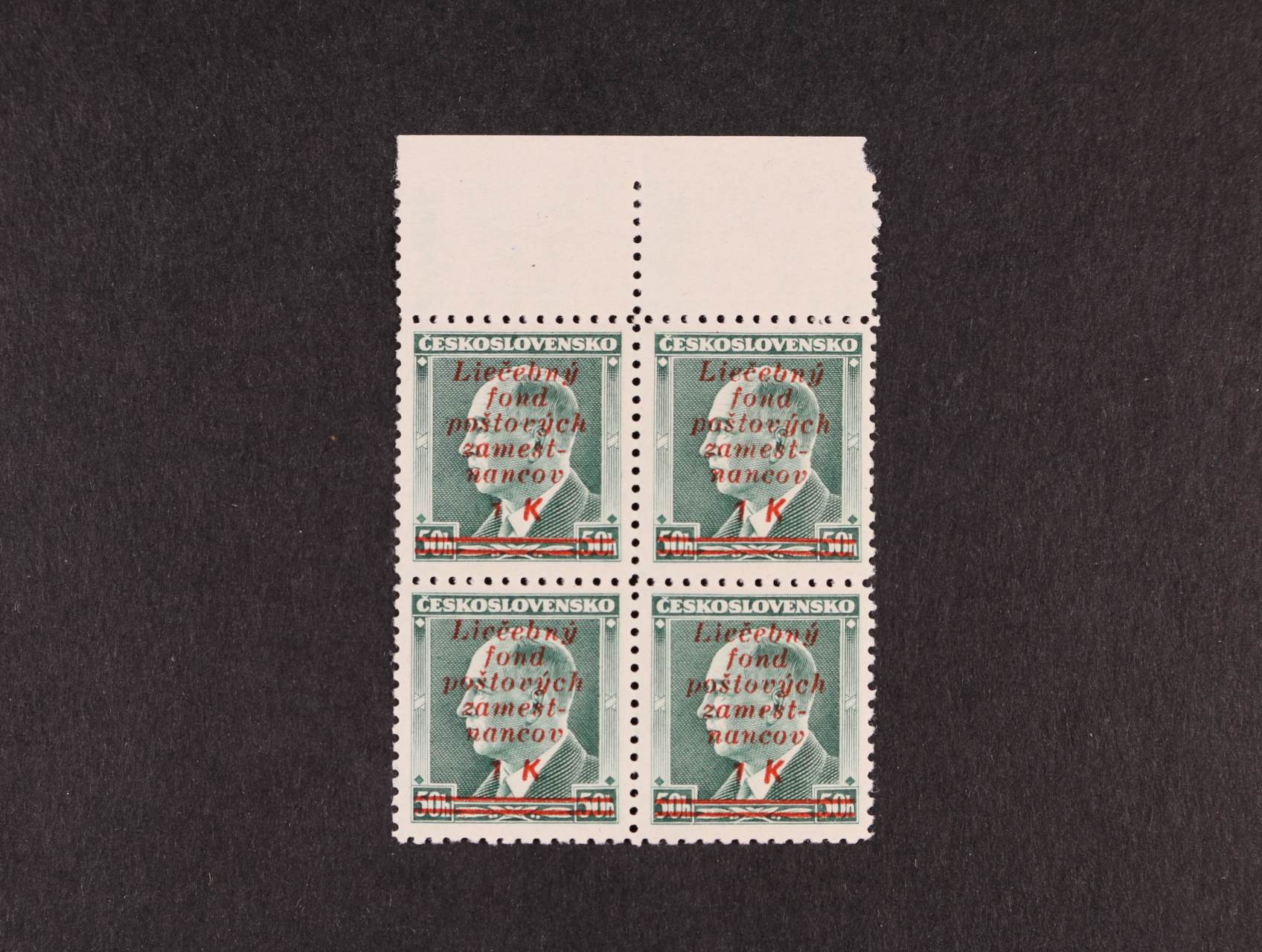 486 zn. č. 314 ve čtyřbloku s horním okrajem a červeným přetiskem Liečebný fond poštových zamestnancov 1K 300