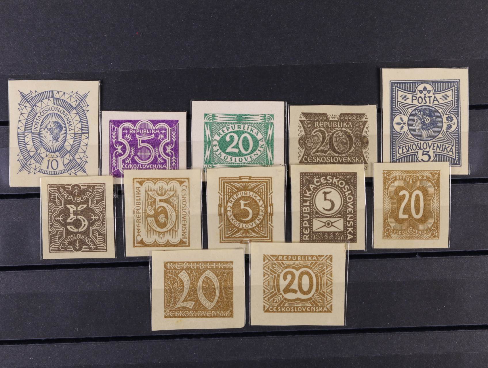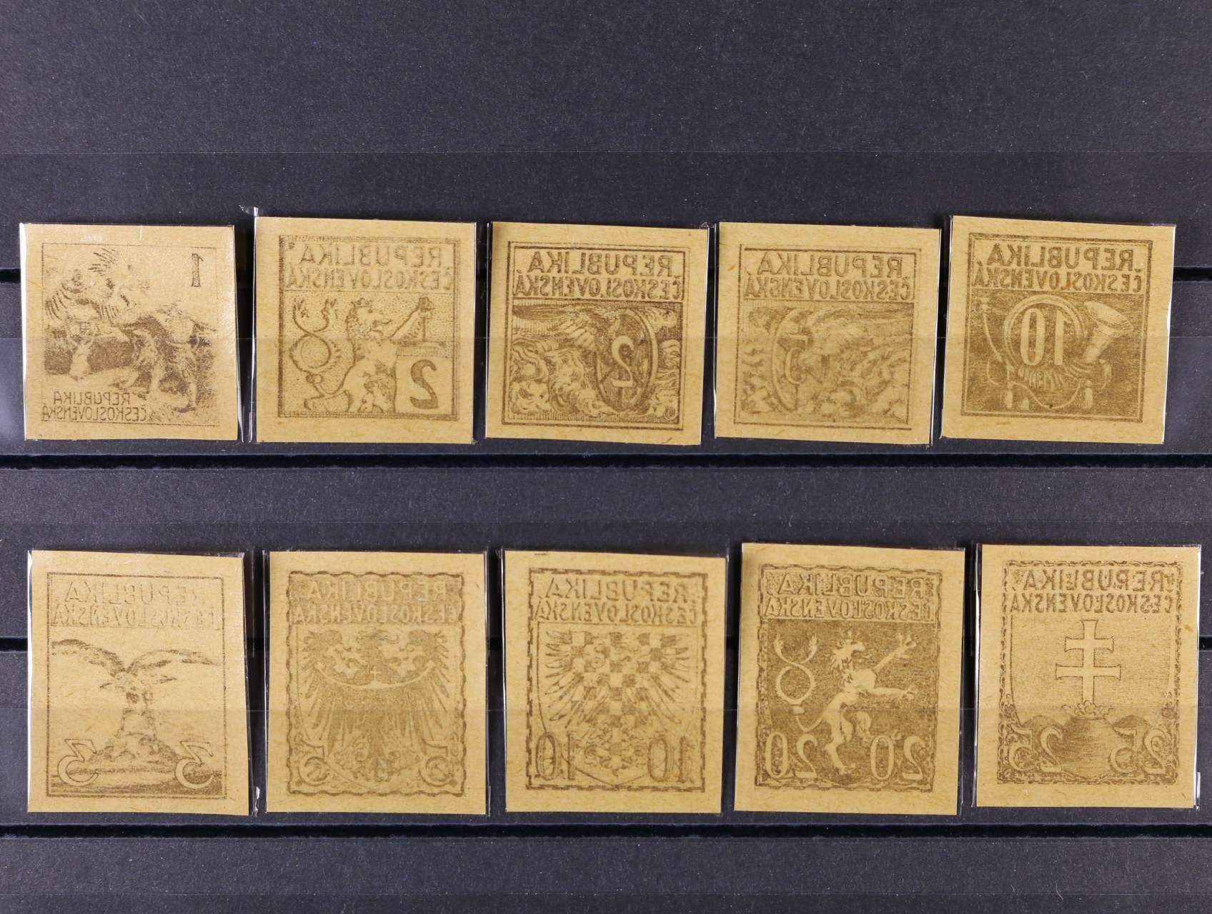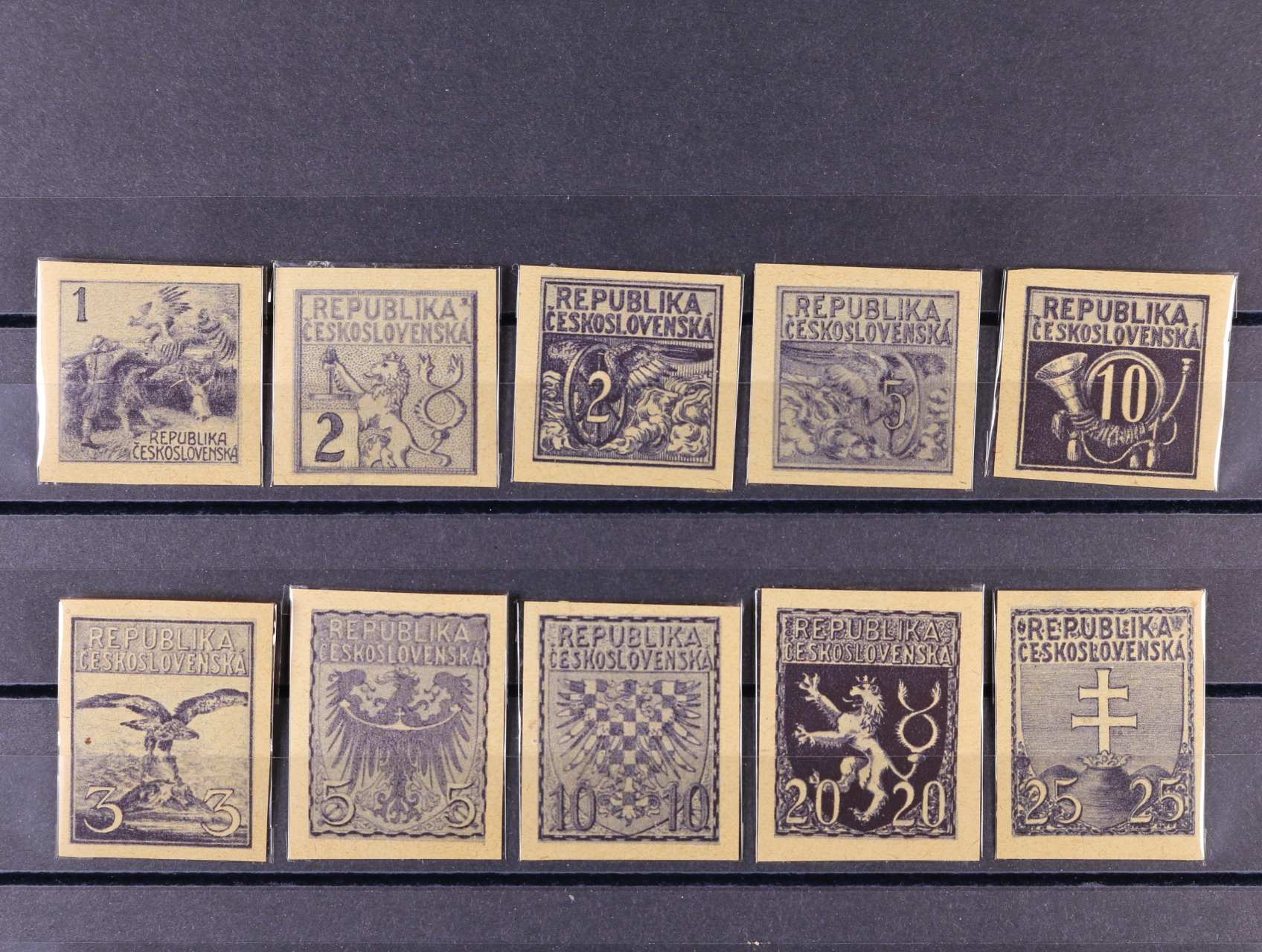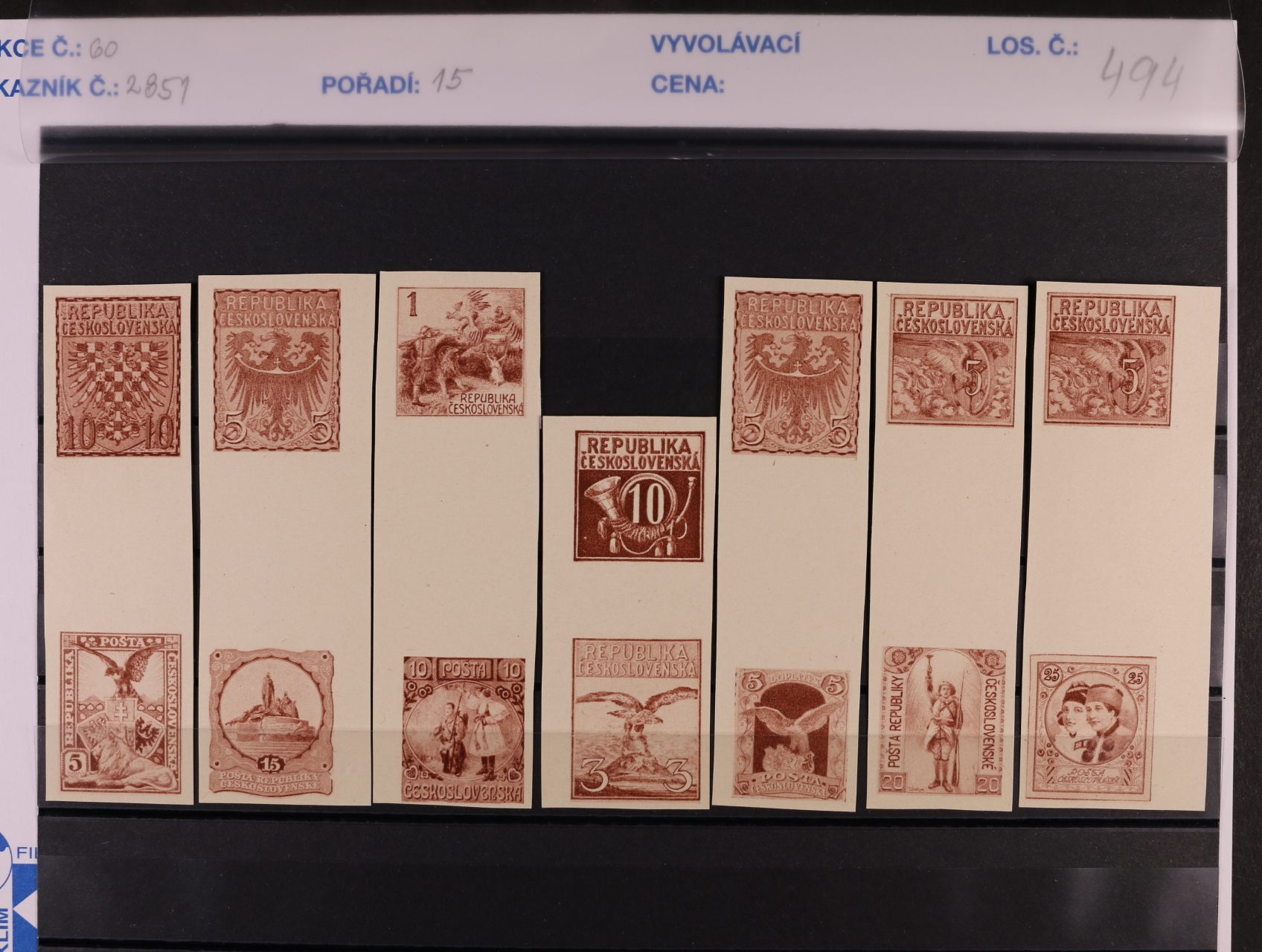 497 sestava 10 ks různých nepřijatých hlubotiskových návrhů Wolkar - Kolbaba, tiskárny Hasse 1918 na kolkové zn. v barvě fialověmodré na nažloutlém papíře s vodorovně rastrovaným lepem, kat. Pofis 2000 Kč 1400