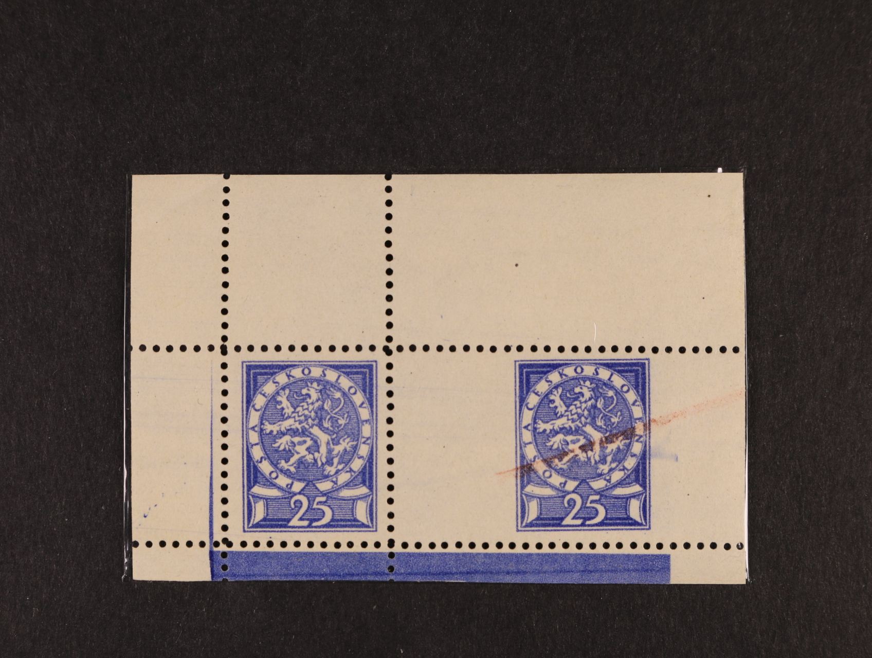 489 nepřijatý návrh V. H. Brunnera na kolkovou zn. 25h český lev v barvě modré na kousku papíru - dvě zn. se zkusmou řádkovou perforací, na okraji stopa po nál. 800