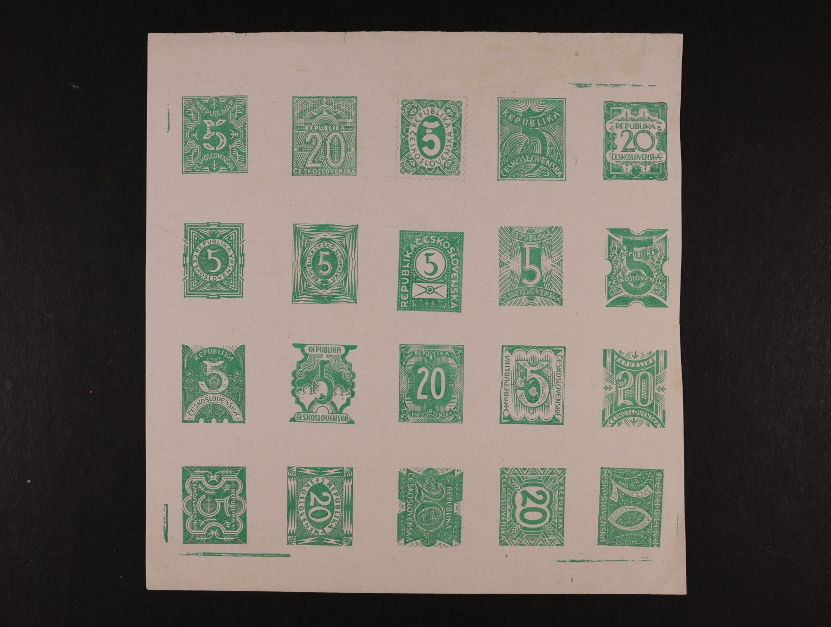 490 soutisk 20ti různých nepřijatých návrhů známek žáků Uměleckoprůmyslové školy v Praze z r. 1918, v barvě zelené na hladkém bílém papíře, zajímavé 1000