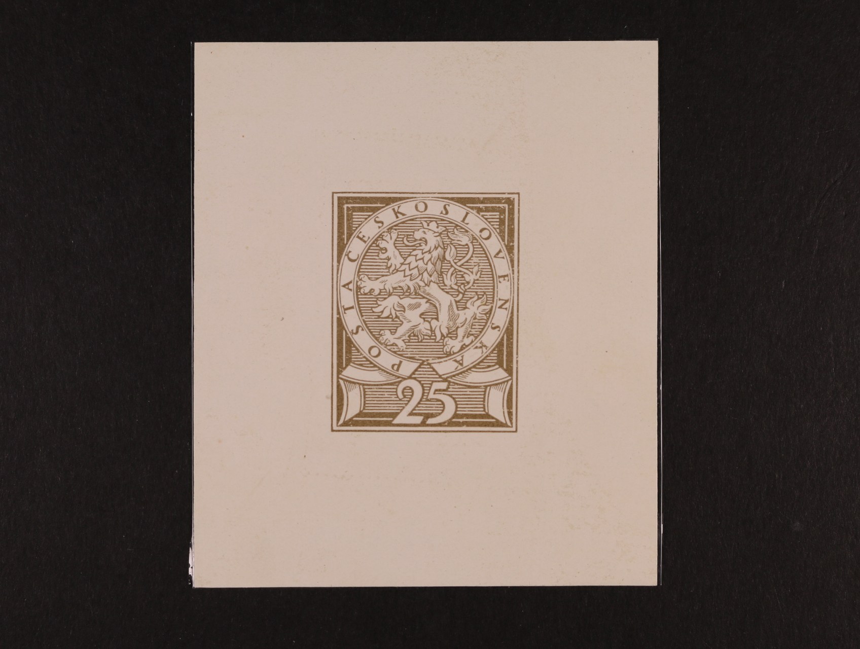 491 nepřijatý návrh V. H. Brunnera na kolkovou zn. 25h český levv barvě šedohnědé, formát 33 x 42 mm, na kousku bílého papíru v aršíkové úpravě 1200