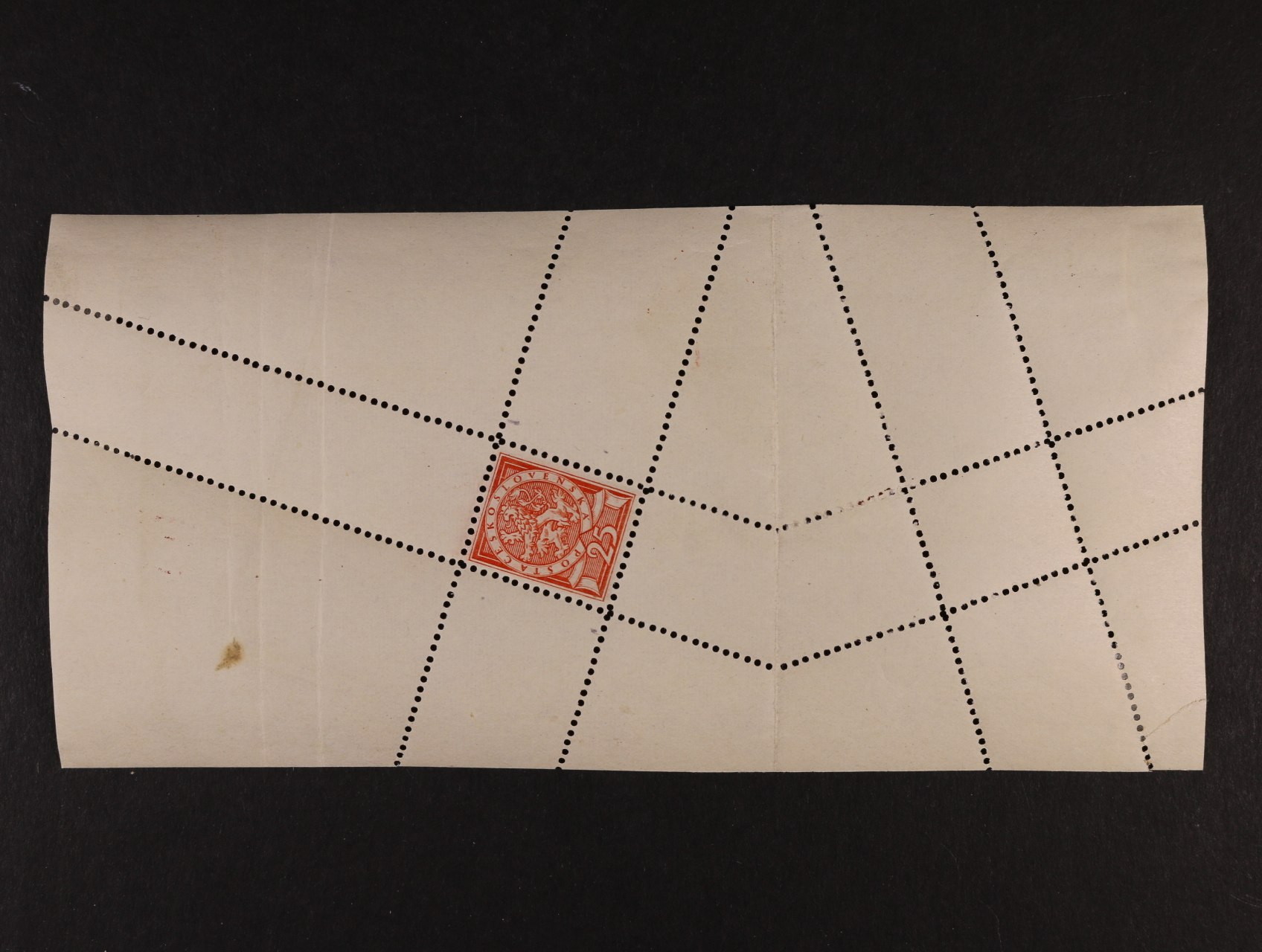 492 nepřijatý návrh V. H. Brunnera na kolkovou zn. 25h český lev, v barvě červené, formát 18 x 23 mm, v aršíkové úpravě s řádkovým zoubkováním s přeložkou papíru, zk. Beneš, na okraji stopy po nál., velmi zajímavé 1500