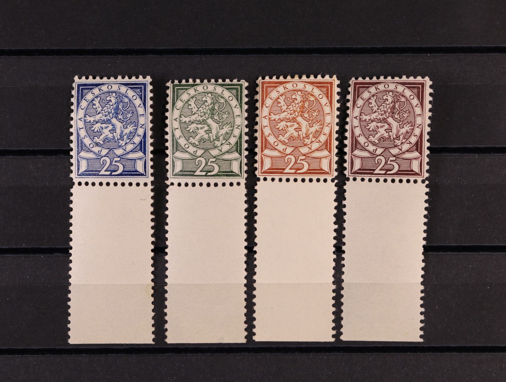 493 sestava 4 ks nepřijatých návrhů V. H. Brunnera na kolkové zn. 25h český lev v barvě modré, zelené, červenohnědé a fialové, všechny se spodním okrajem, zk. Beneš, kat. Pofis 3000 Kč 1800
