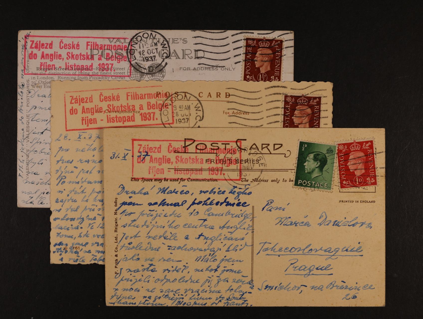 499 sestava 3 ks celistvostí z Londýna do ČSR s různými pod. raz., + přídavné červené rámeč. raz. Zájezd České Filharmonie do Anglie, Skotska a Belgie, říjen - listopad 1937 200