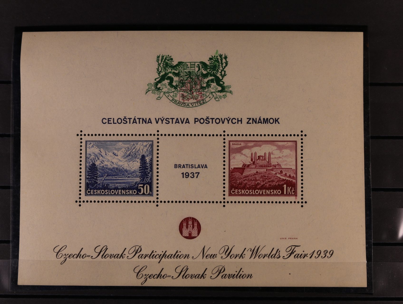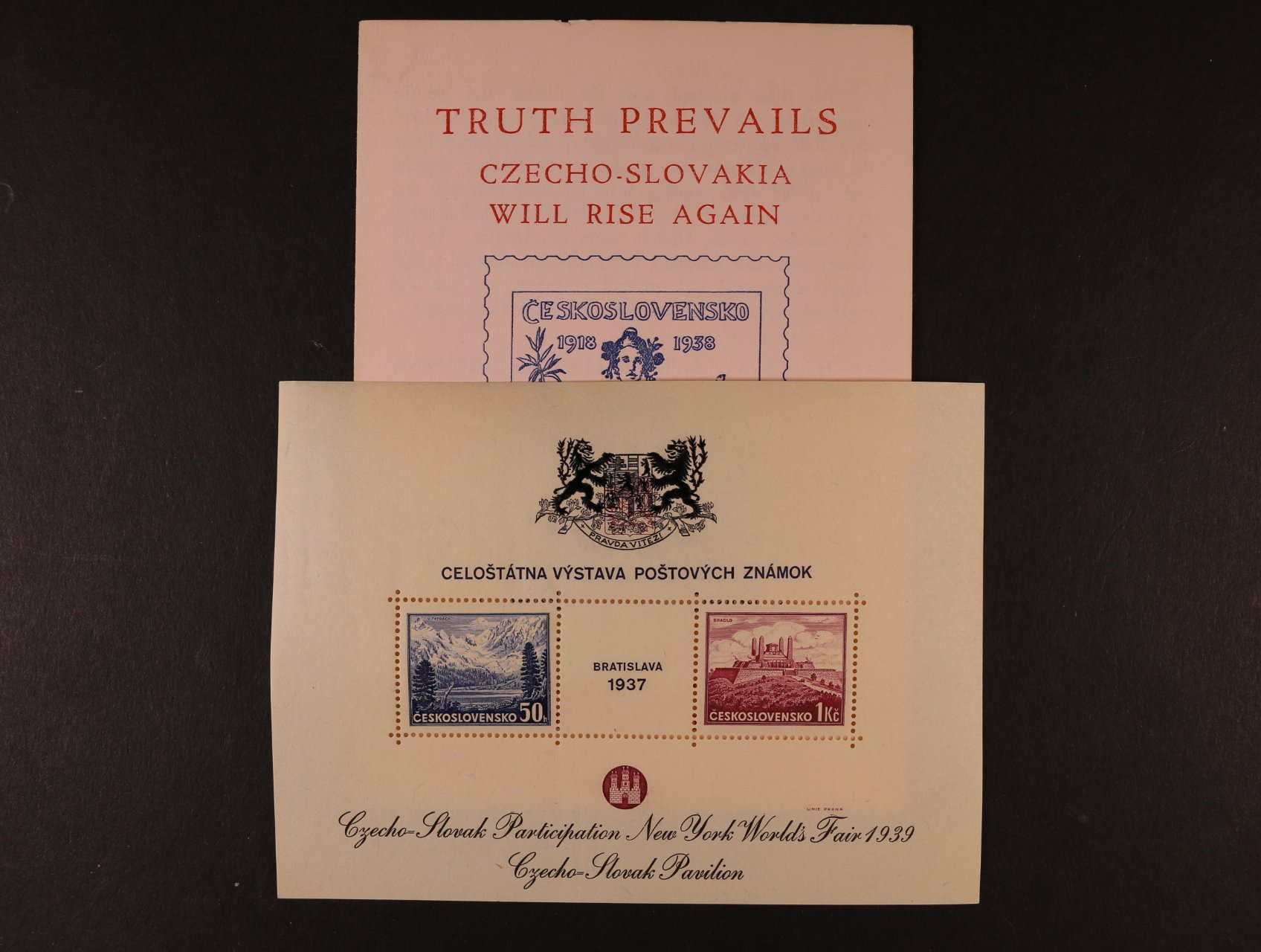502 A č. 329/330 se zlatým přítiskem pro výstavu NEW YORK 1939, kat. cena 1500 Kč 1200