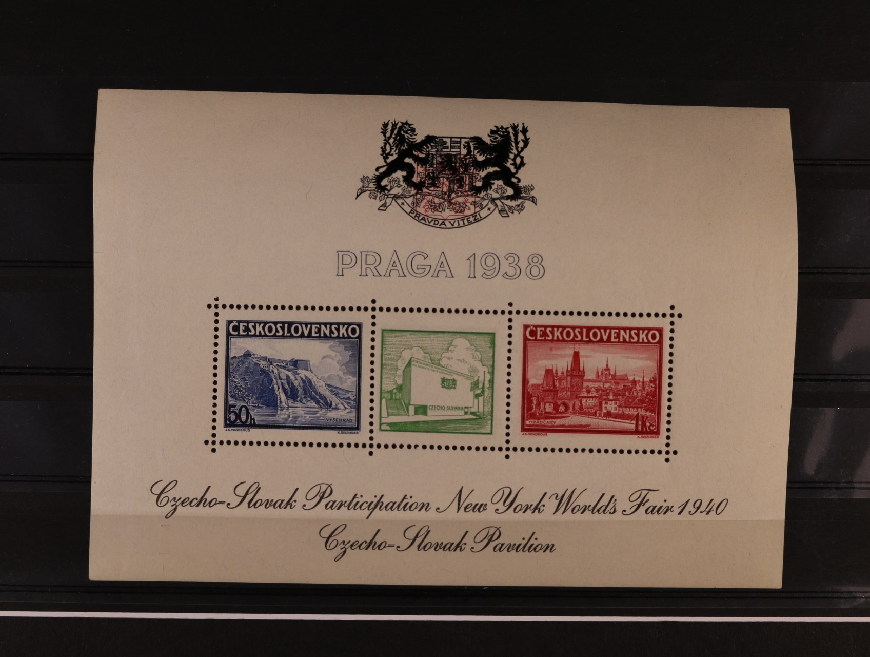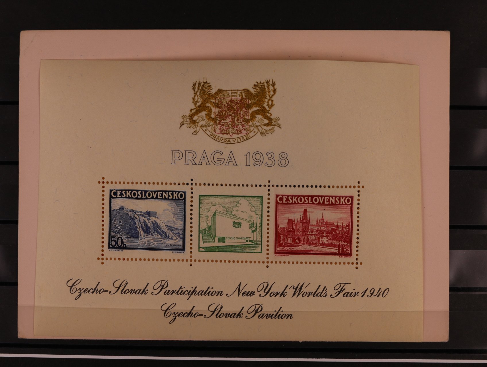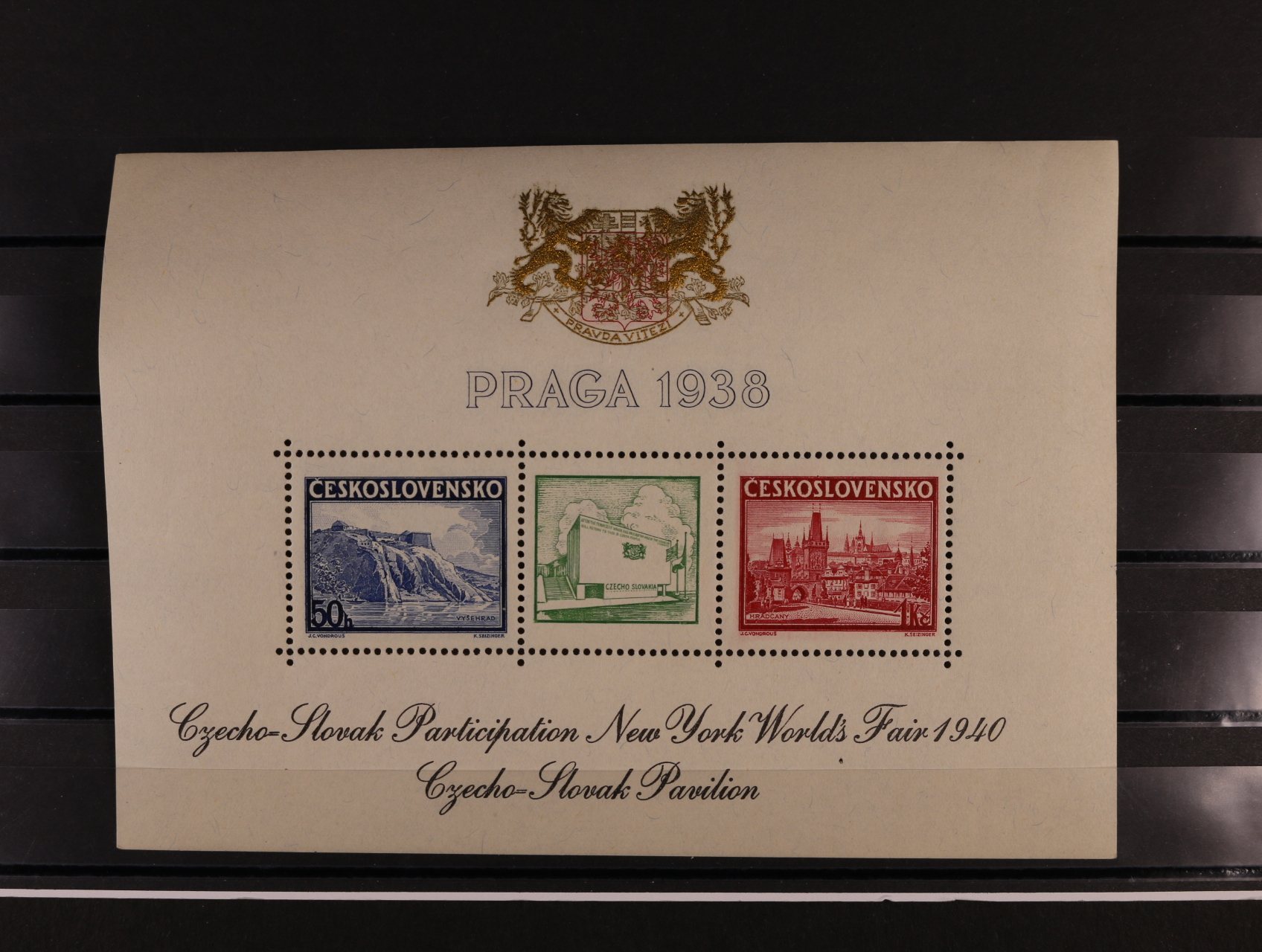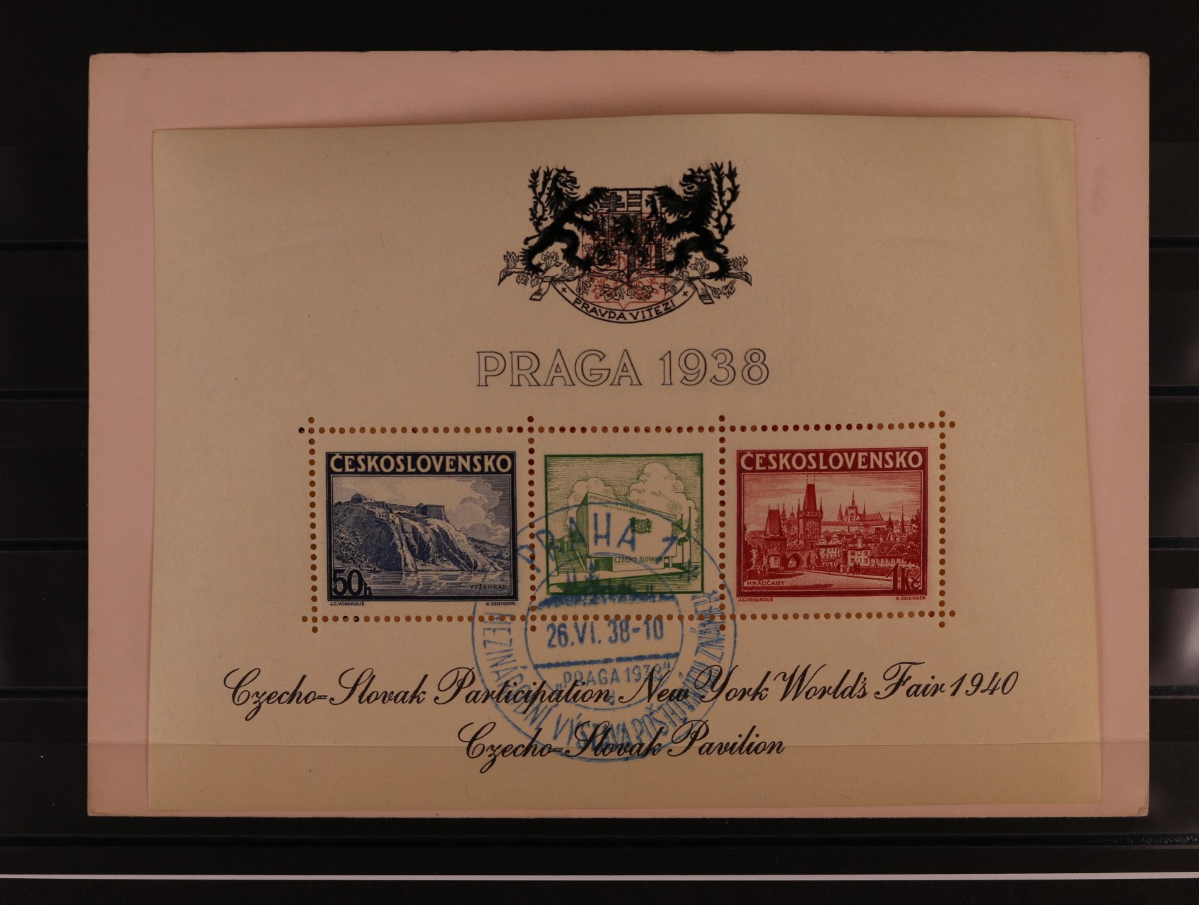 513 A č. 342/343 s černým přítiskem pro výstavu NEW YORK 1940 s modrým pam. raz. PRAHA 1 MEZINÁRODNÍ VÝSTAVA POŠTOVNÍCH ZNÁMEK 26.6.38, v původních destičkách 600
