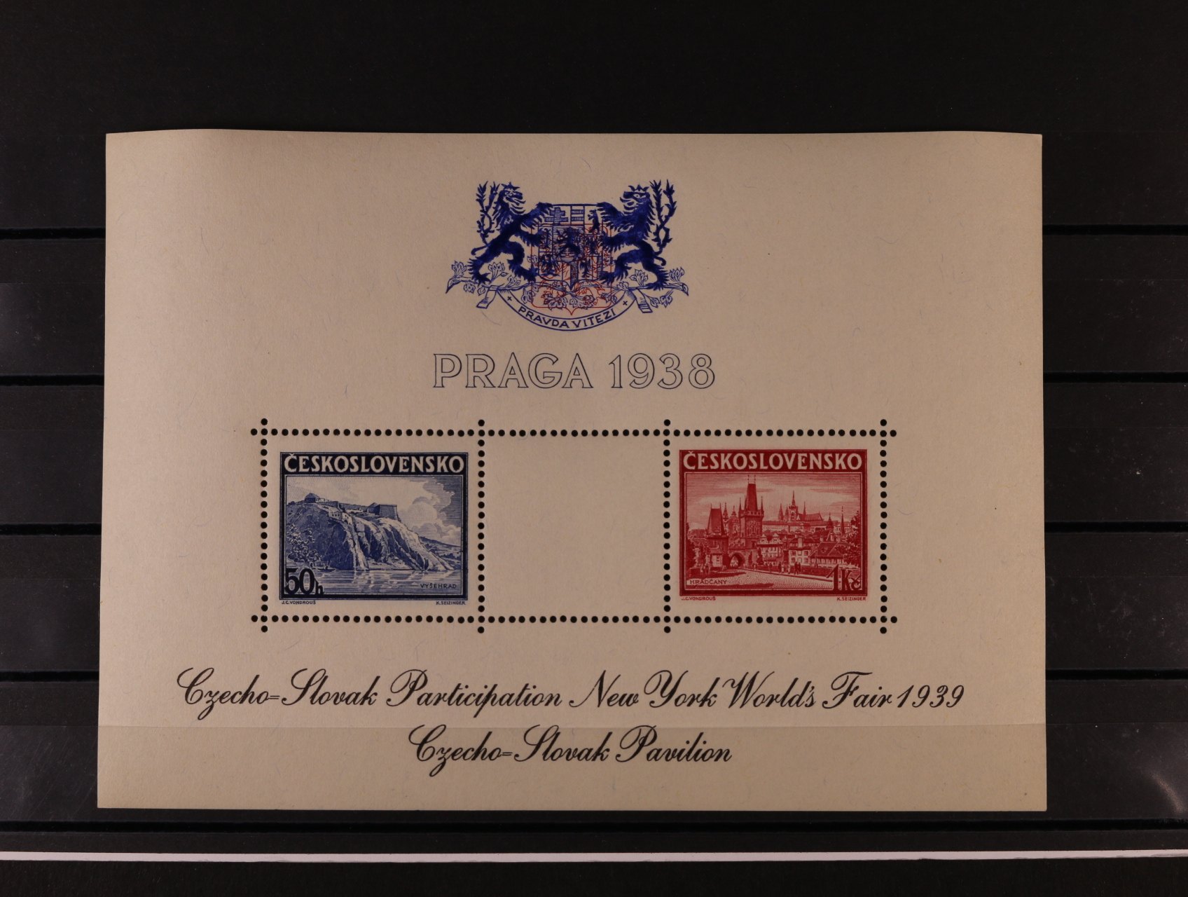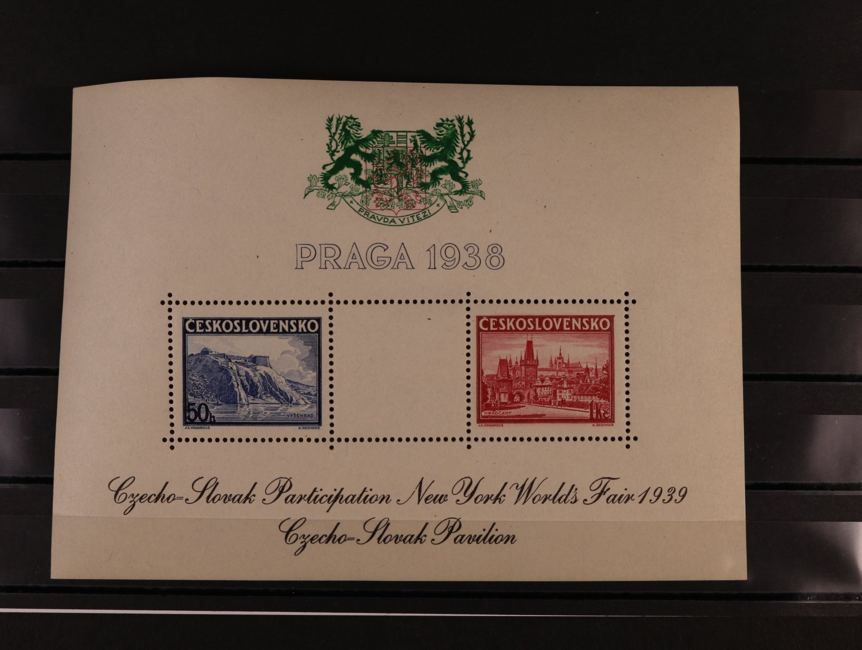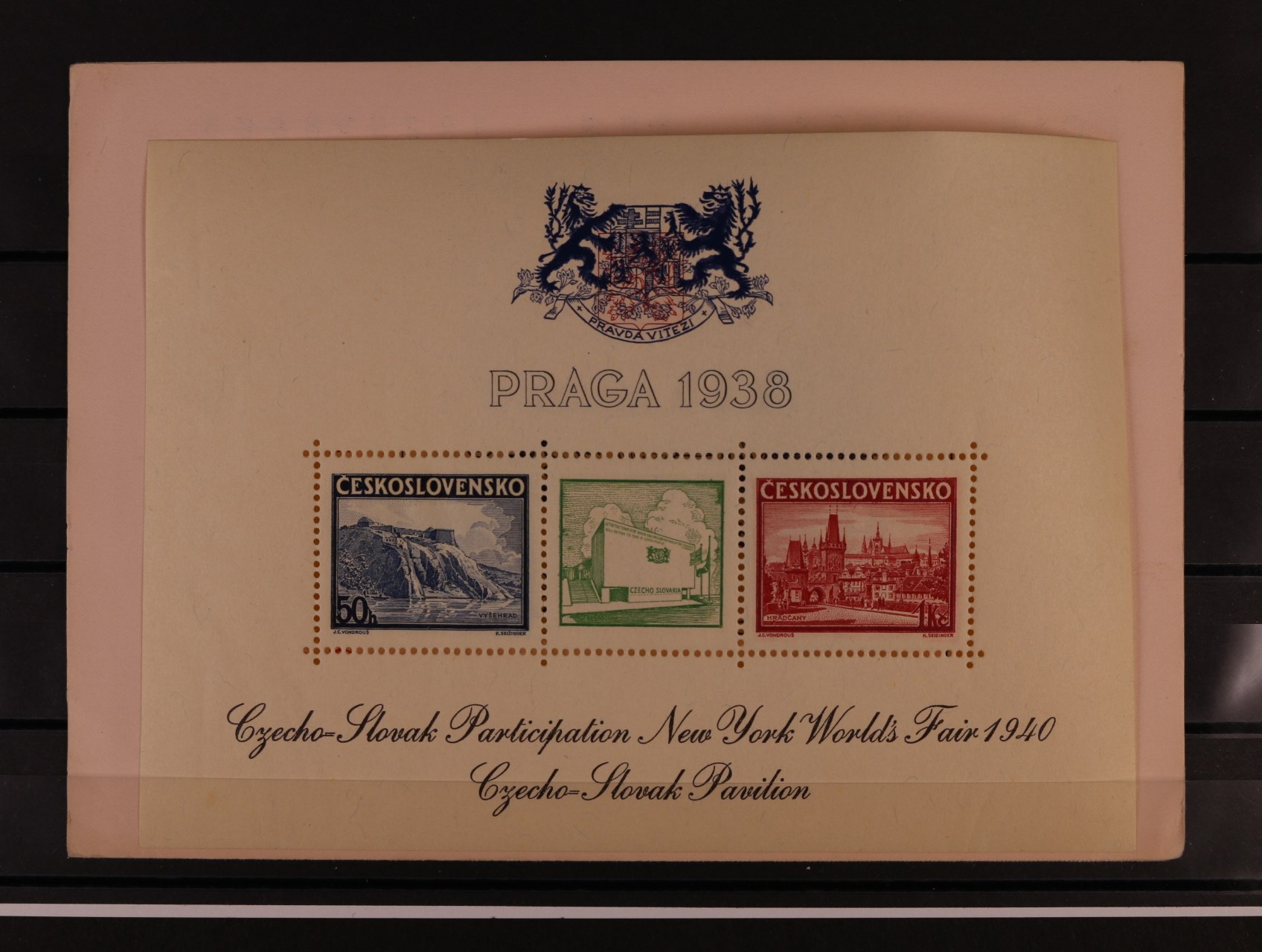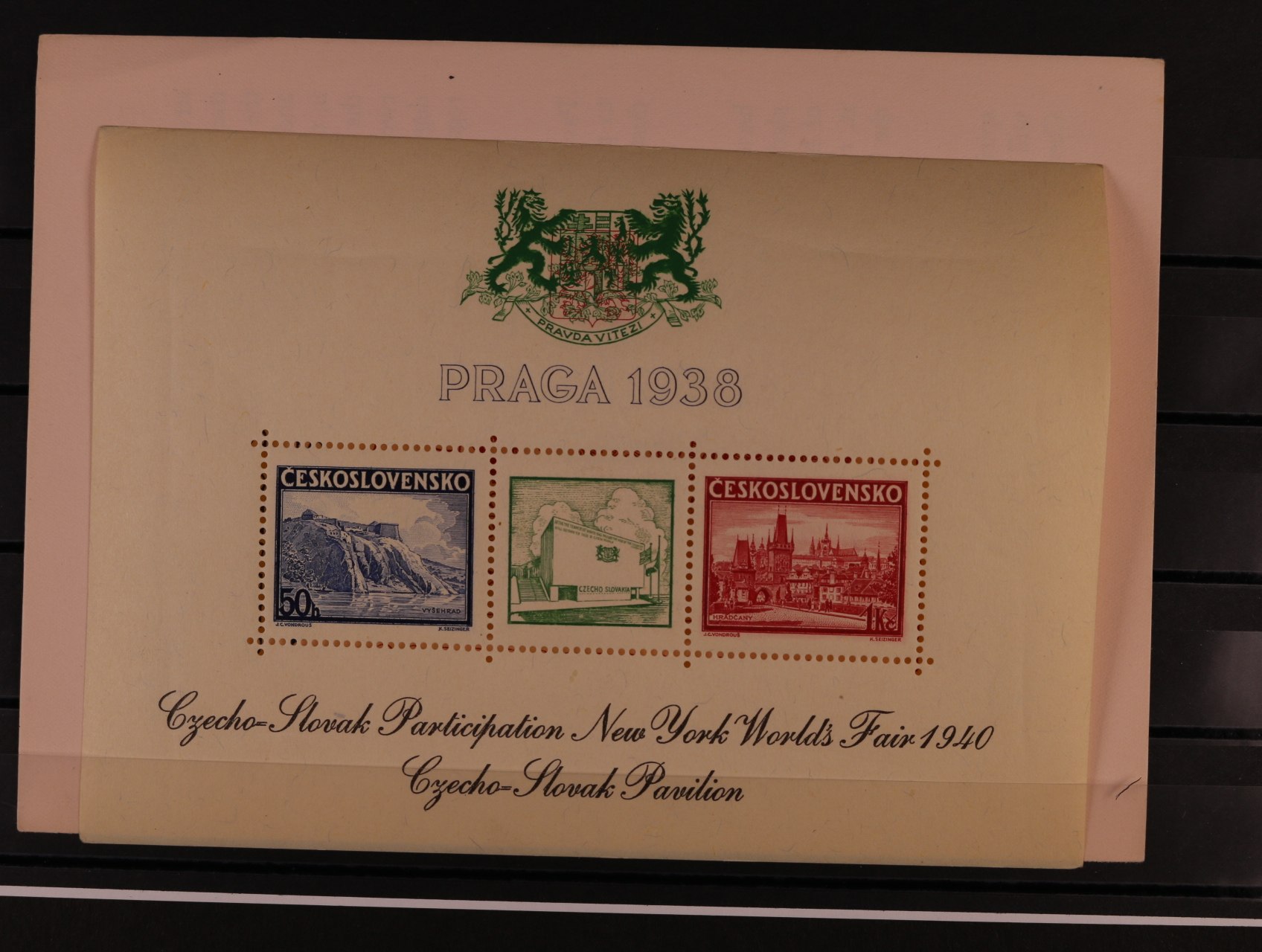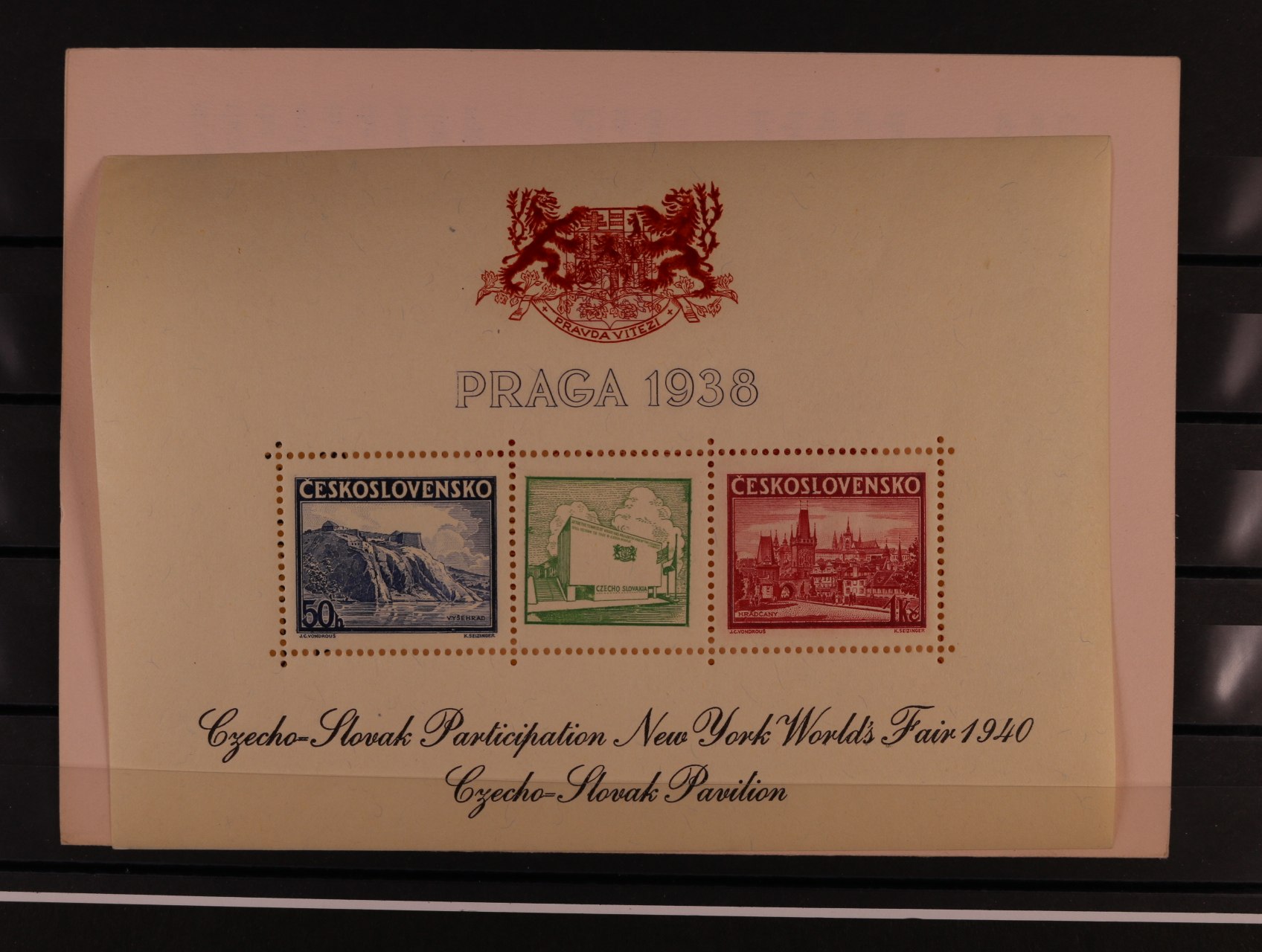 513 A č. 342/343 s černým přítiskem pro výstavu NEW YORK 1940 s modrým pam. raz. PRAHA 1 MEZINÁRODNÍ VÝSTAVA POŠTOVNÍCH ZNÁMEK 26.6.38, v původních destičkách 600