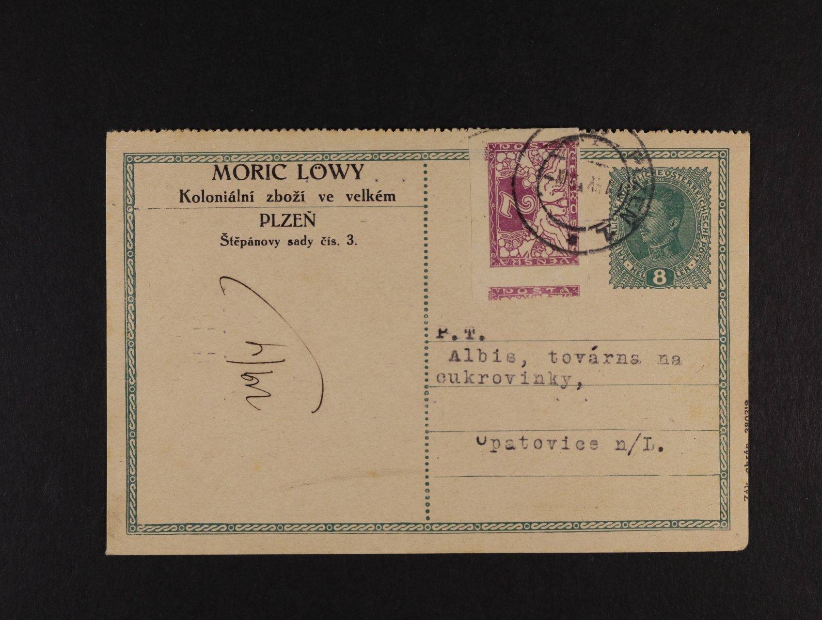 517 firemní R-U KL s natištěnou zn. 8h Karel s perforací pro psací stroj na horním okraji, dofrank. zn. S č. 1, pod. raz. PLZEŇ 10.4.1919 400