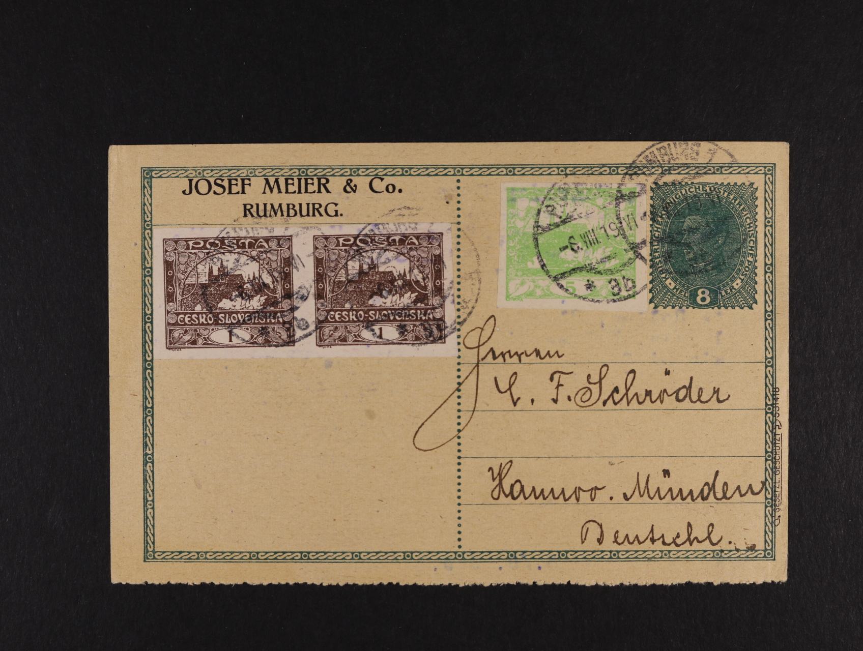 518 Předběžné - Rak. firemní celina 8h Karel s perforací pro psací stroj, zaslaná do Německa, dofrank. zn. č. 1 ve vodorovné dvoupásce + zn. č. 3, pod. raz. RUMBURG 6.8.19 900