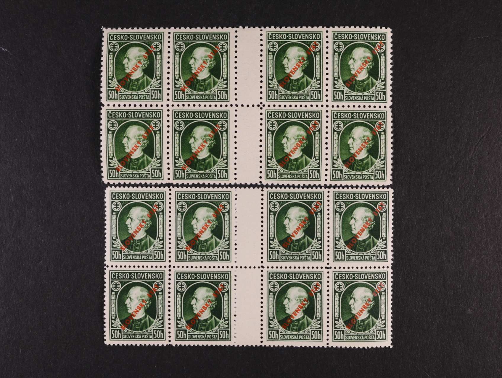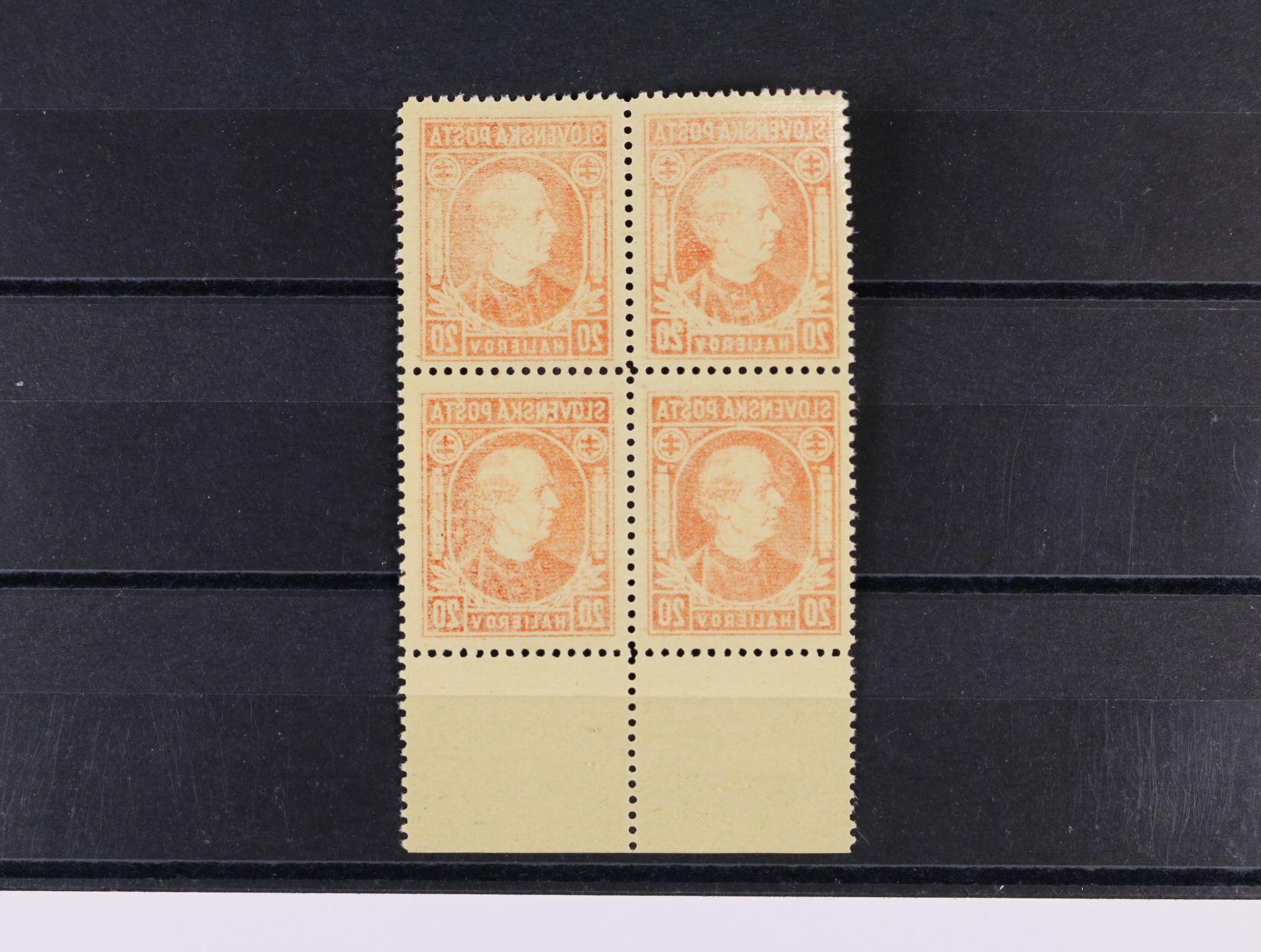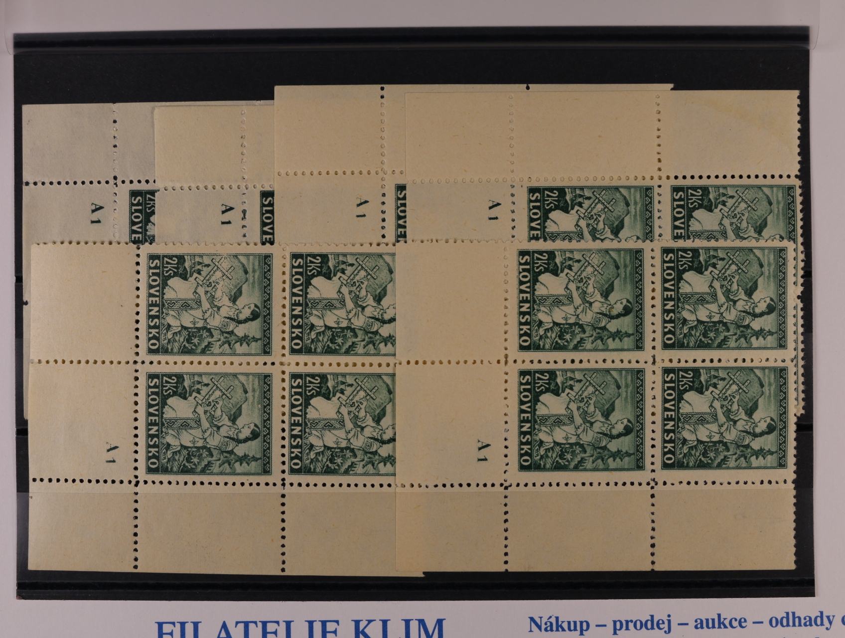 zn. č. 26 A ve vodorovné třípásce s posunem svislé perforace svěží, zn. č. 29 A ve vodorovné dvoupásce s vynechanou střední svislou perforací bez lepu, zn. č. 30 ve vodorovné dvoupásce s okraji a šikmou krajovou perforací, zn. č. 32 A ve čtyřbloku s pravým okrajem a dvojitou svislou perforací