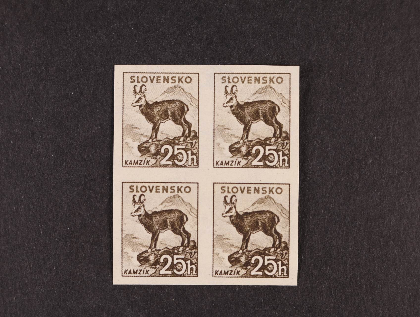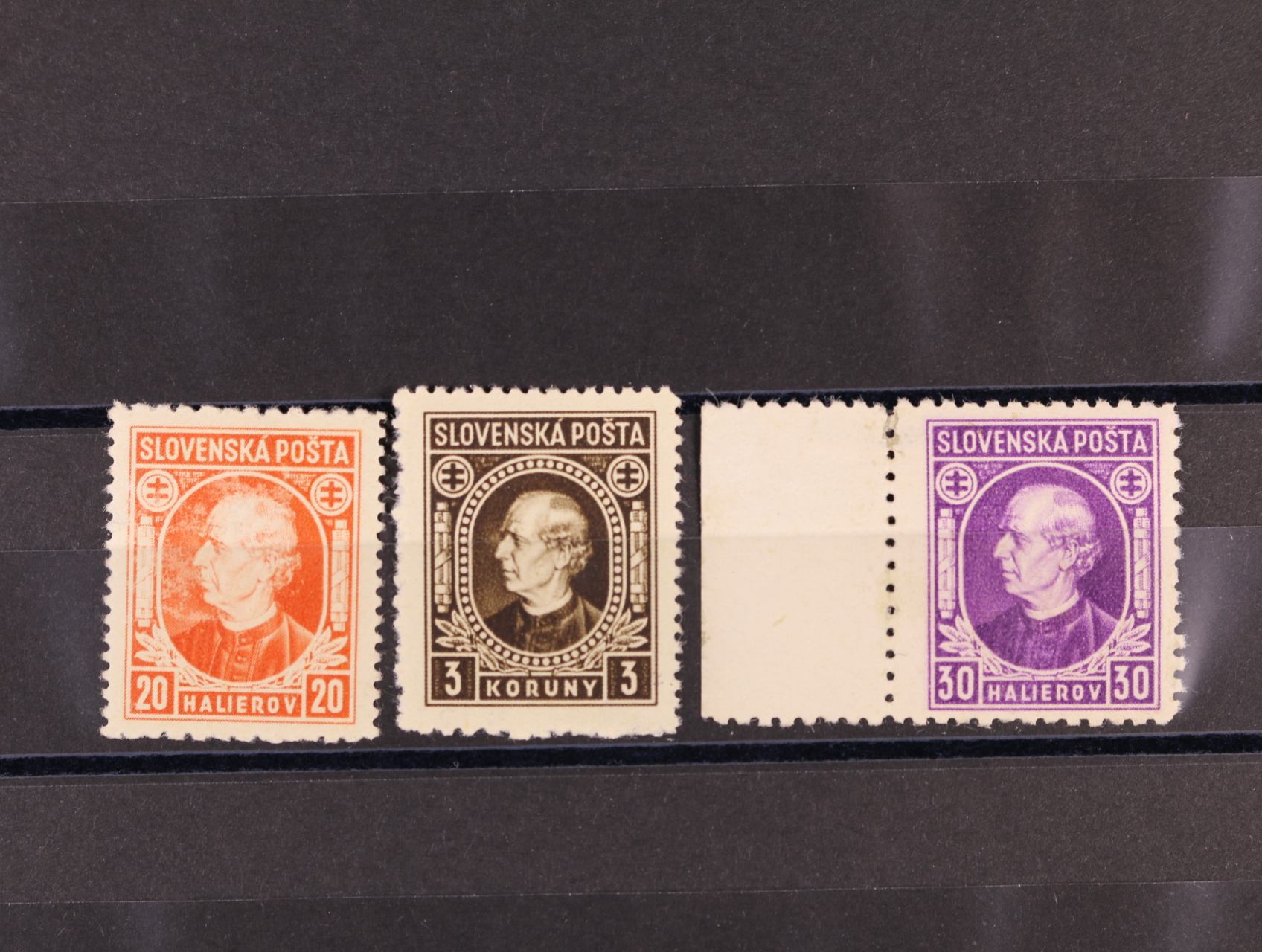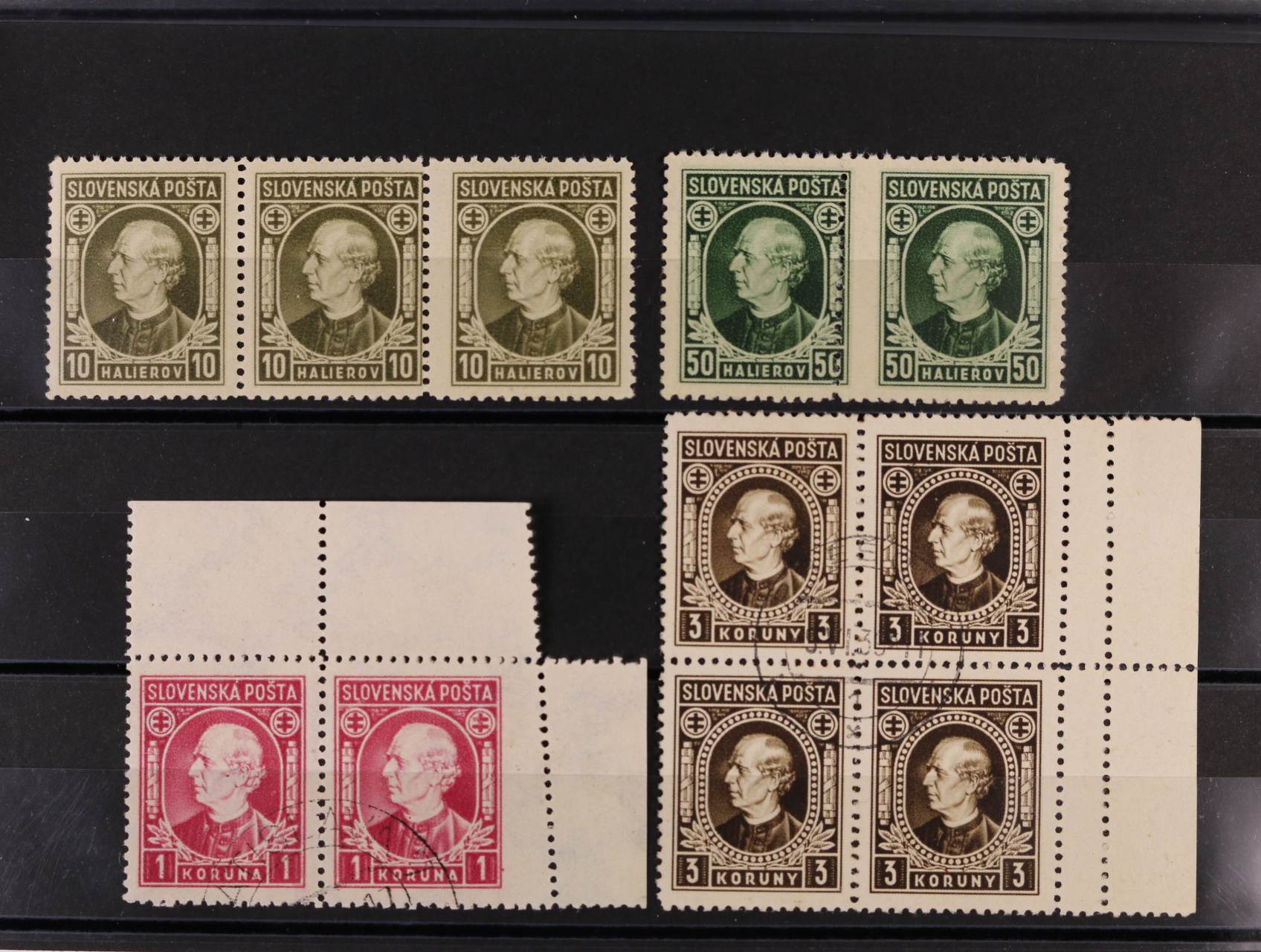 zn. č. 26 A ve vodorovné třípásce s posunem svislé perforace svěží, zn. č. 29 A ve vodorovné dvoupásce s vynechanou střední svislou perforací bez lepu, zn. č. 30 ve vodorovné dvoupásce s okraji a šikmou krajovou perforací, zn. č. 32 A ve čtyřbloku s pravým okrajem a dvojitou svislou perforací