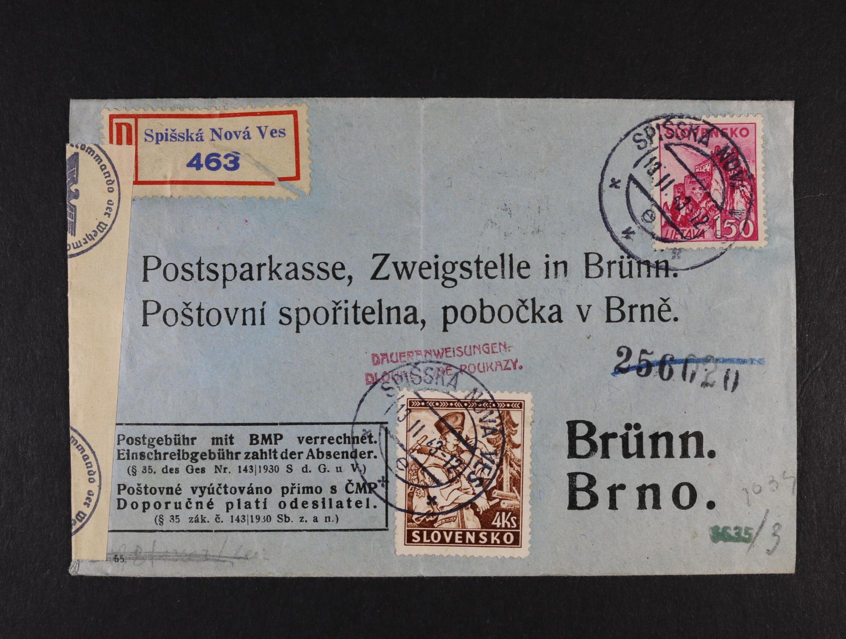 úřední dopis poštovní spořitelny frank. zn. č. 40, 53, pod. raz. SPIŠSKÁ NOVÁ VES 13.2.43, RECO, cenzurní páska, cenzurní a přích. raz., velmi zajímavé