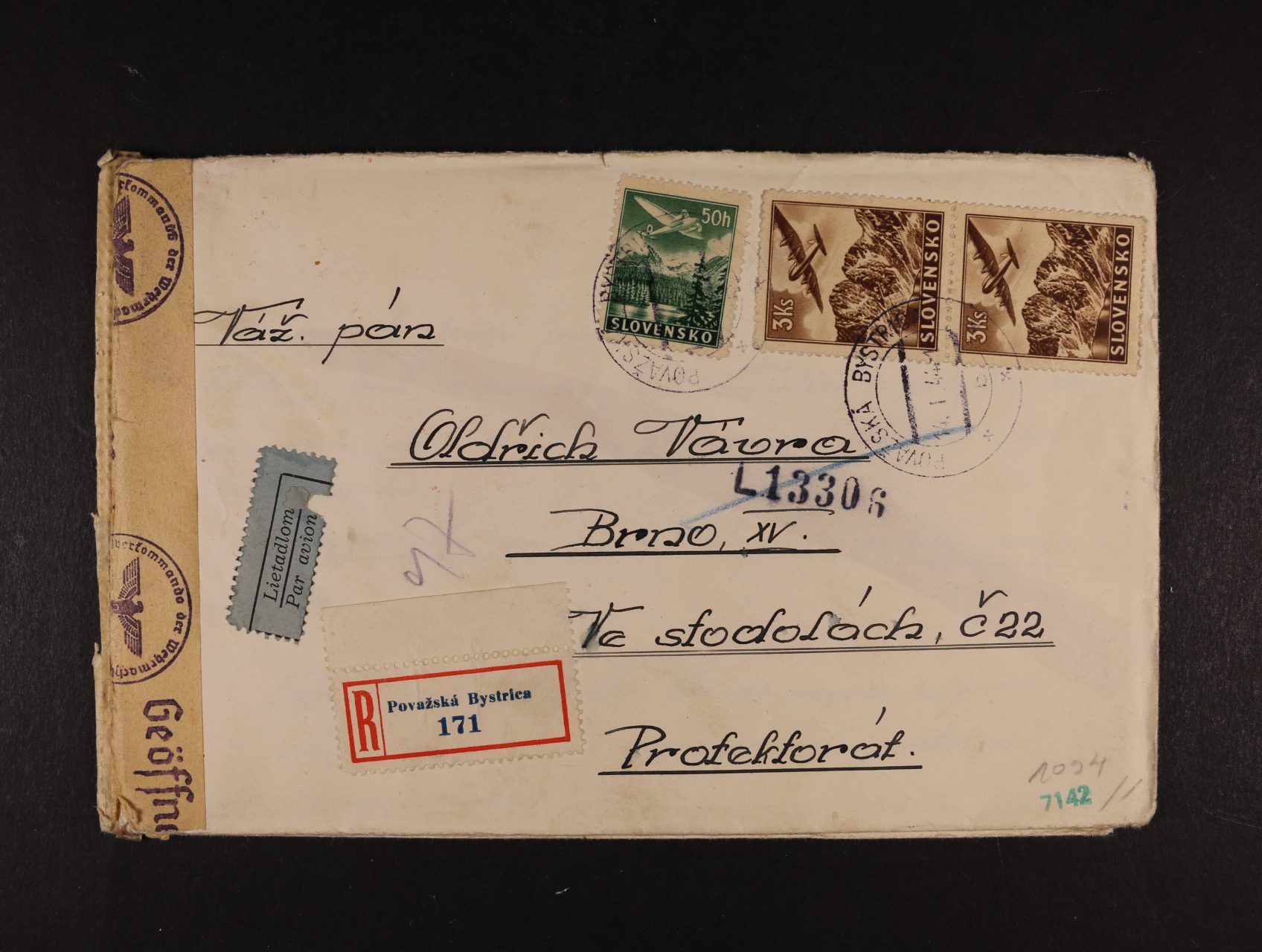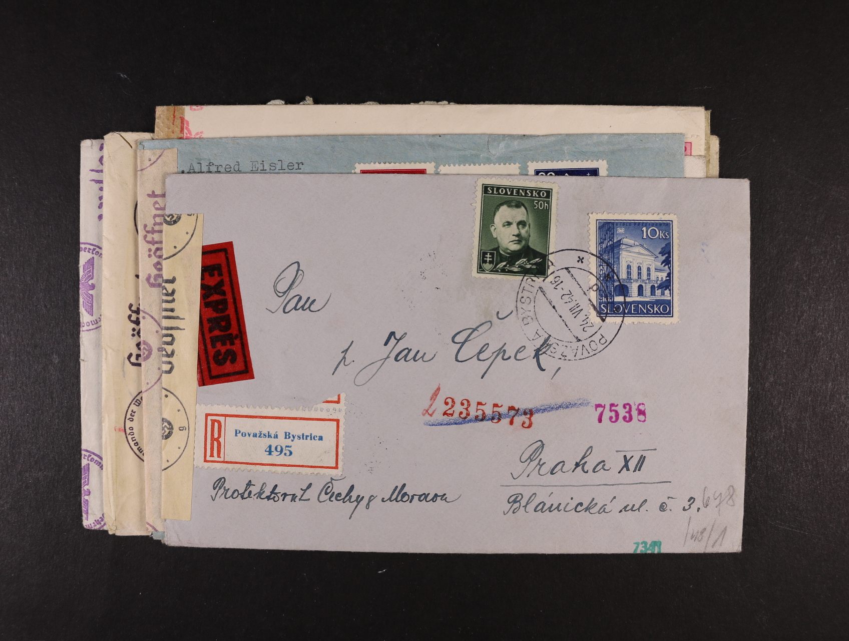 sestava 3 ks let. dopisů - 2x RECO, 1x R-EXPRES do Protektorátu, zajímavé frankatury, cenzurní pásky, razítka