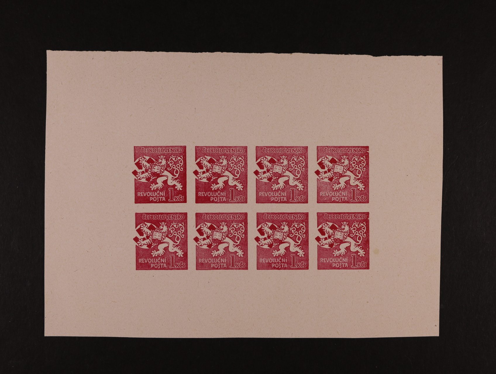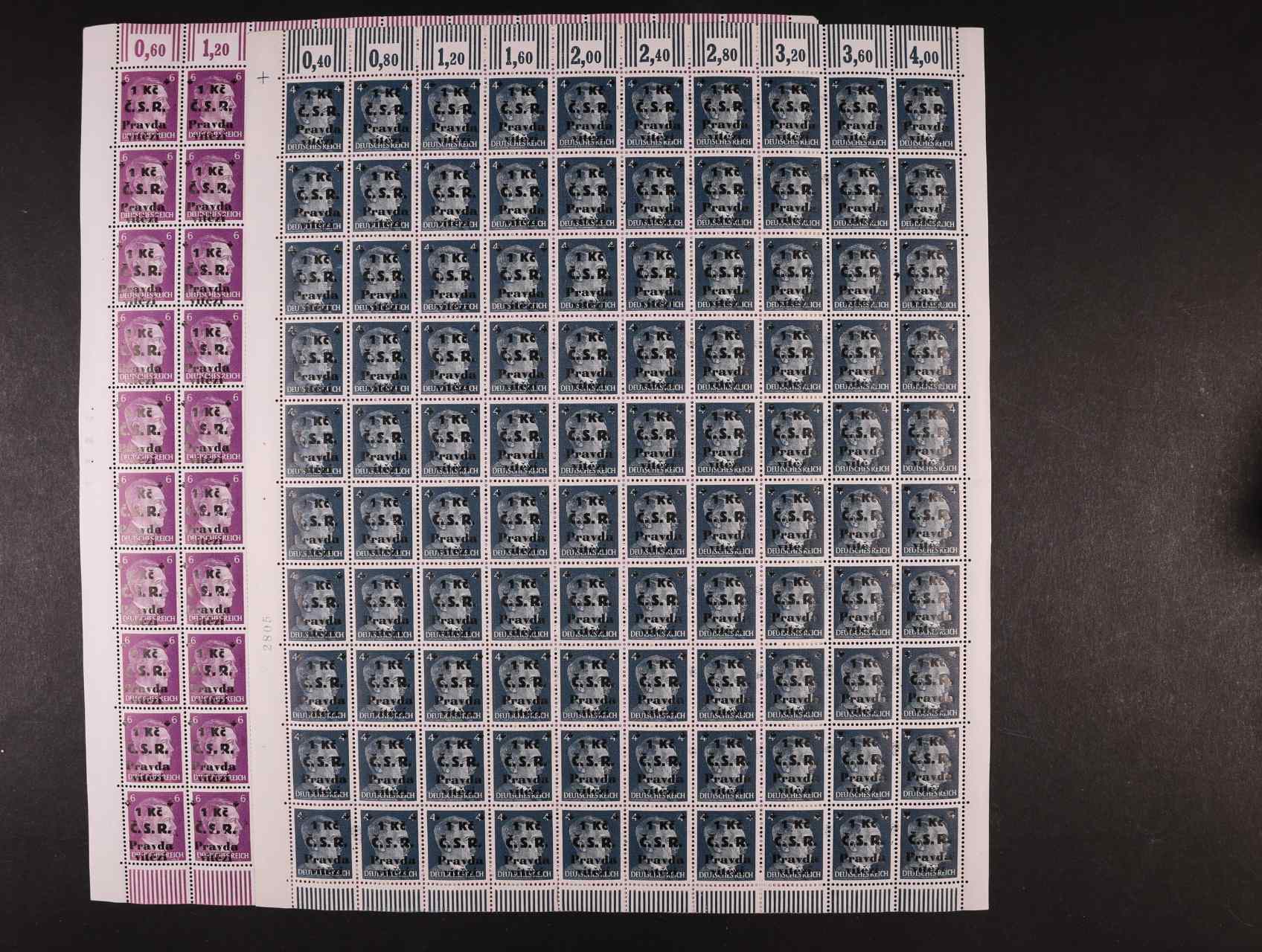 Cheb - dva kompl. archy zn. 4 a 6pf A.H. s černým přetiskem 1 Kč Č.S.R. Pravda vítězí