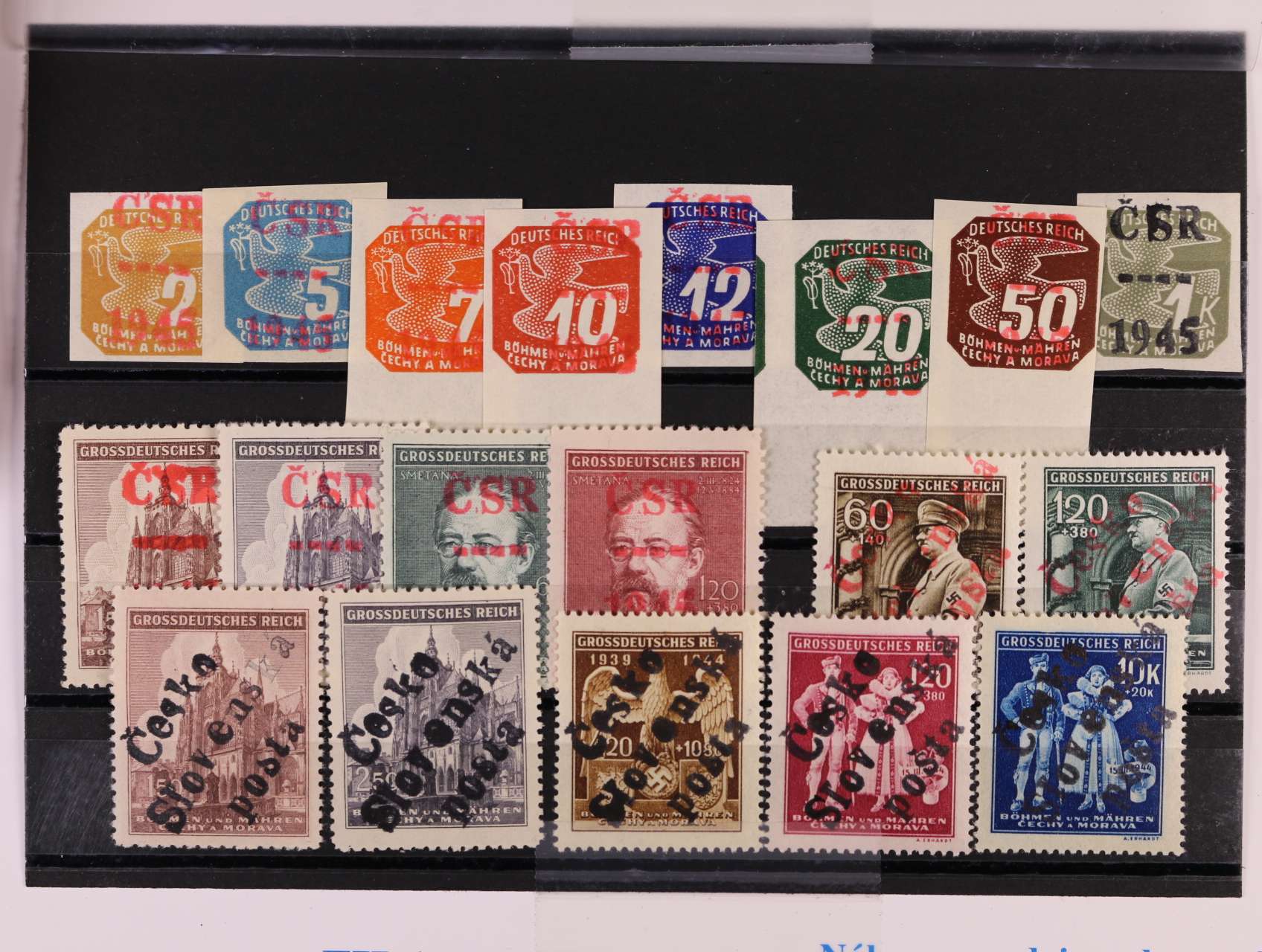 sestava 19 ks protektorátních a německých zn. s červeným nebo černým přetiskem ČSR 1945, resp Česko Slovenská pošta