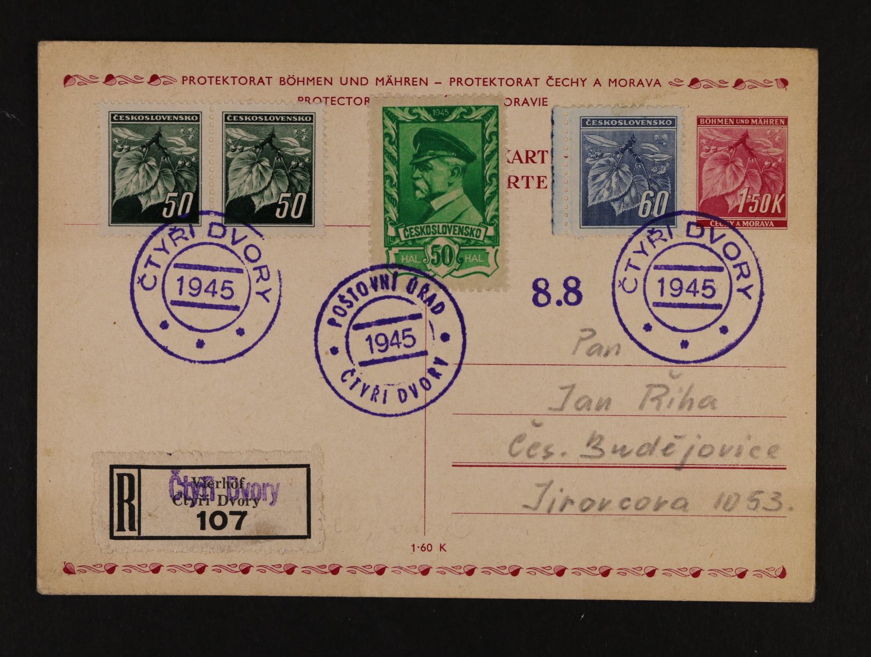 protektorátní celina 1,50K dofrank. čs. výplatními zn., zaslaná RECO do Čes. Budějovic, pod. raz. POŠTOVNÍ ÚŘAD ČTYŘI DVORY 1945 + datumovka 8.8., provizorní R-nálepka a přiložený pod. lístek