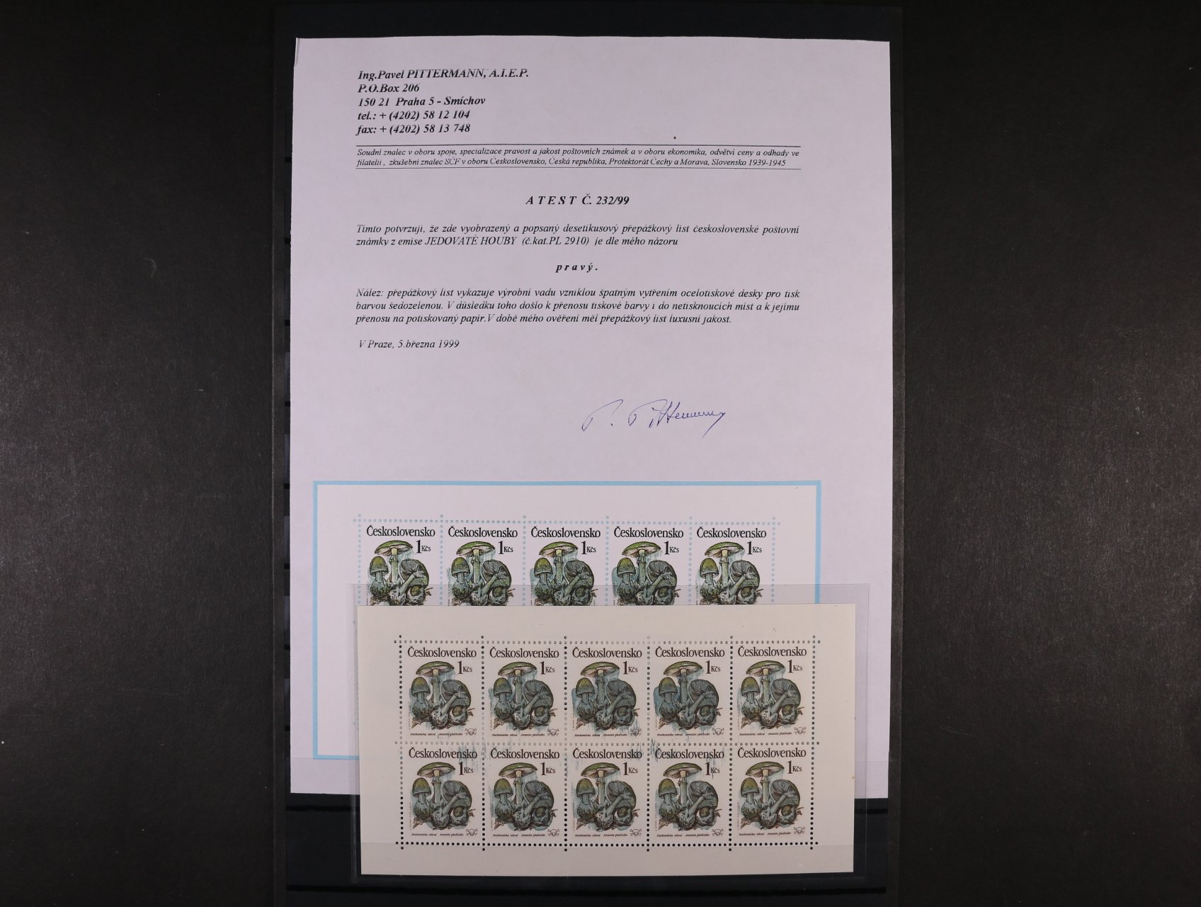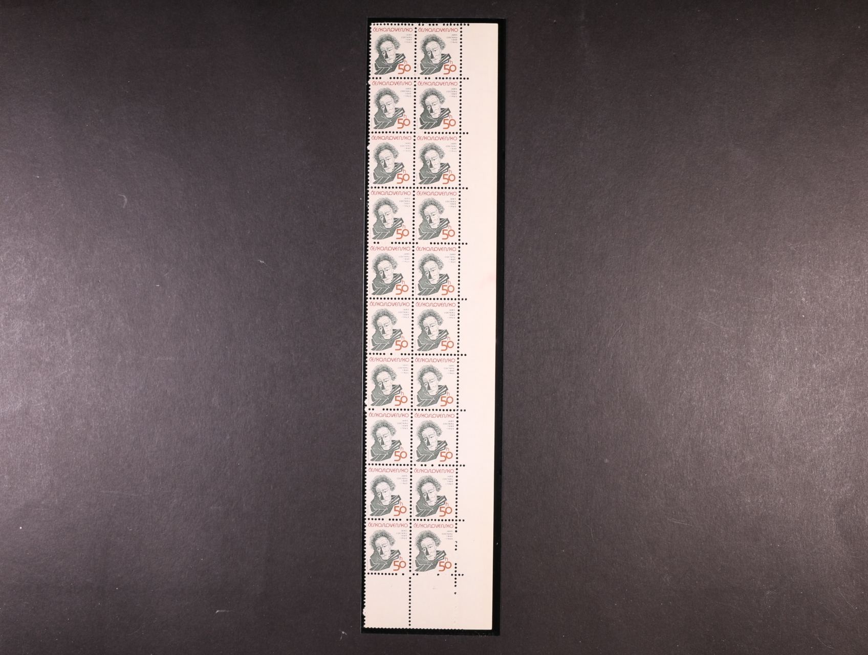 zn. č. 2881 VV2 - úplný pravý krajní 20ti-blok PA. Posunem perforace nahoru vznikl ve spodní části PA tzv. "pseudokupon", kat. cena min. 5000 Kč