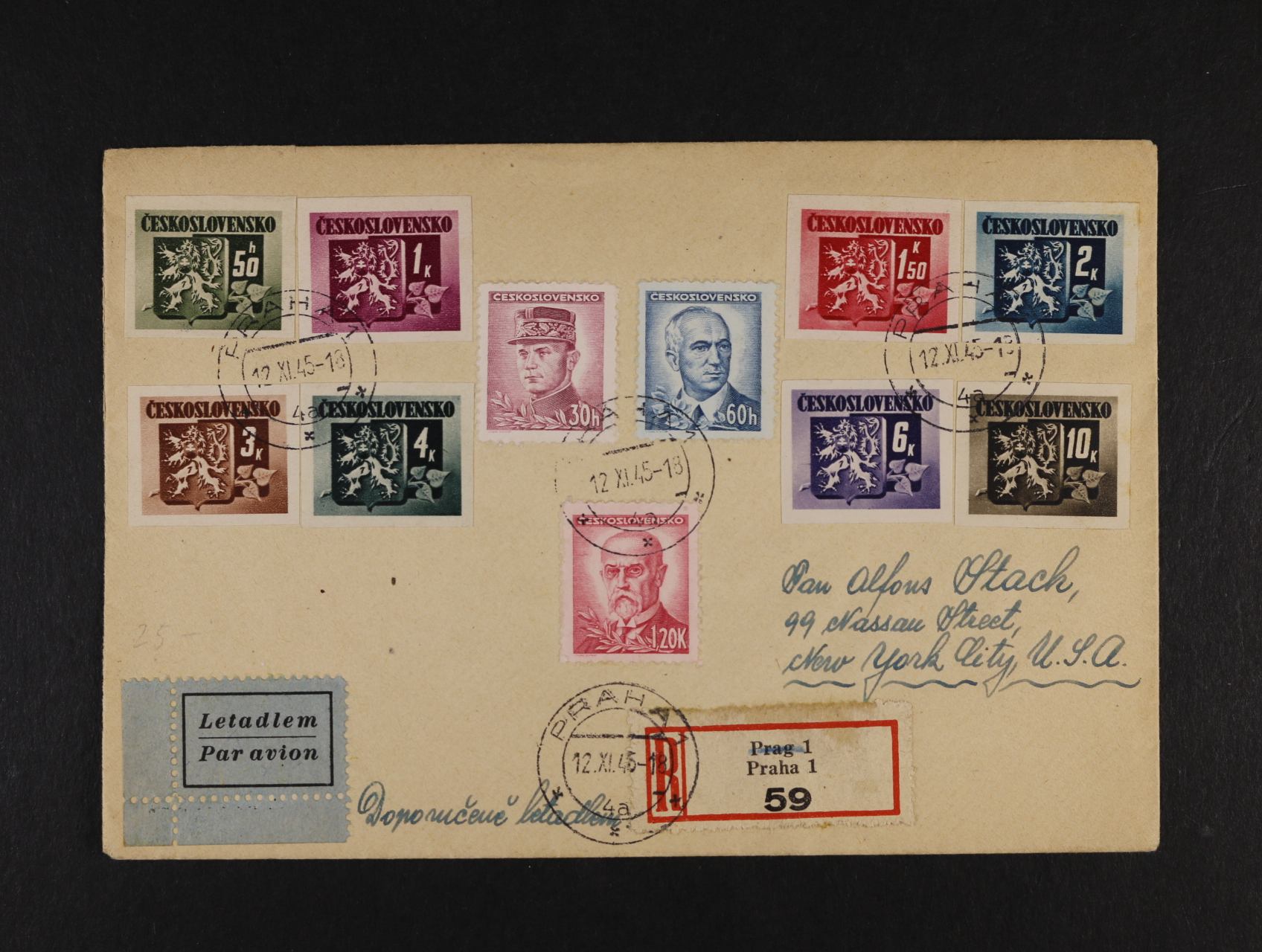 R-dopis do New Yorku frank. pestrou vysokou frankaturou, pod. raz. PRAHA 1 12.11.45, průch. a přích. raz. NEW YORK 20.11.45