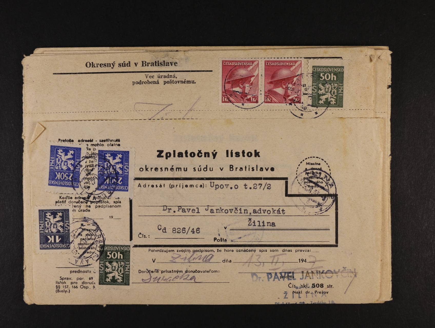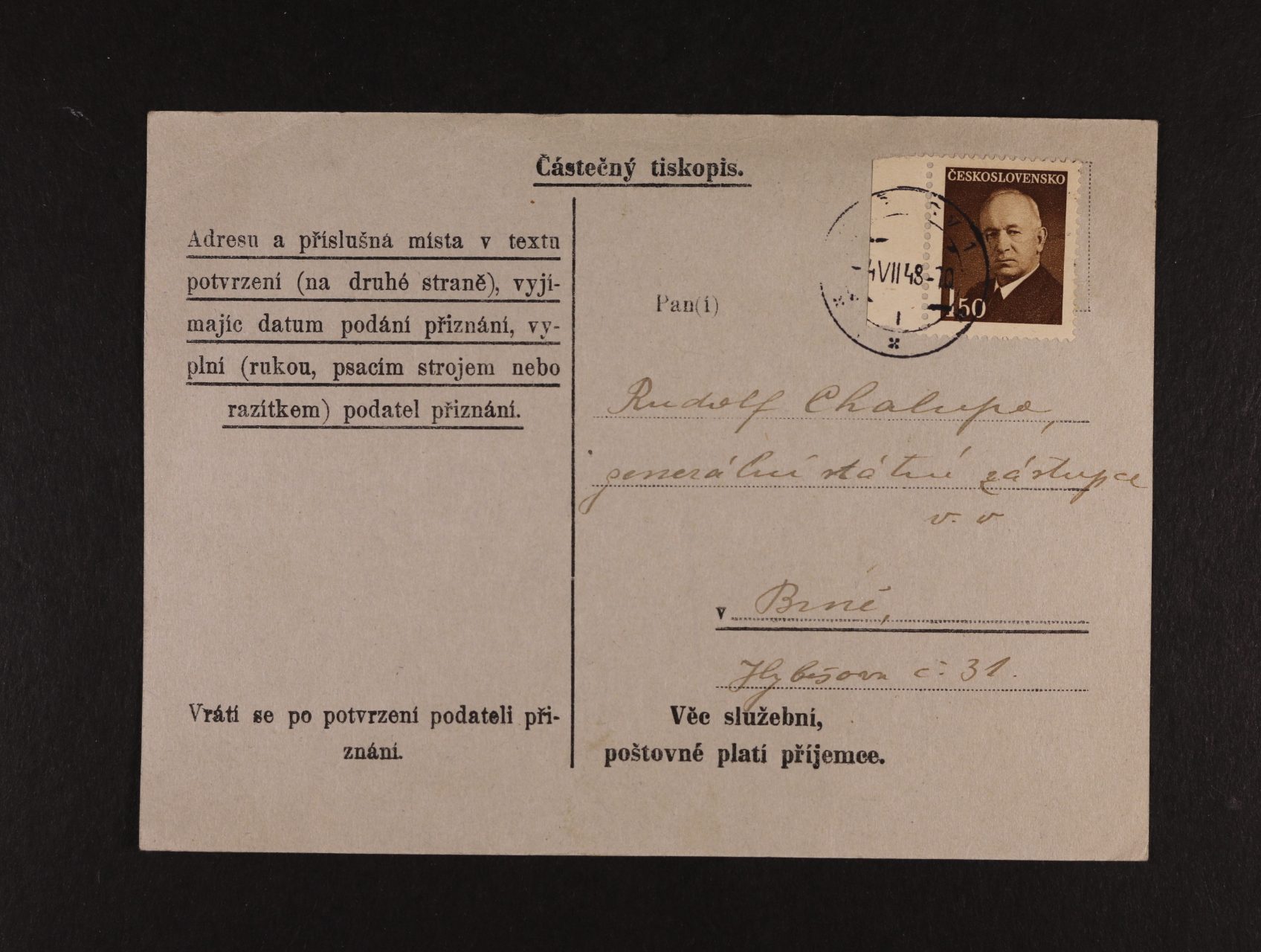"Částečný tiskopis" do Brna frank. zn. č. 464, pod. raz. VYŠKOV 4.7.48, na zadní straně prezenční raz.