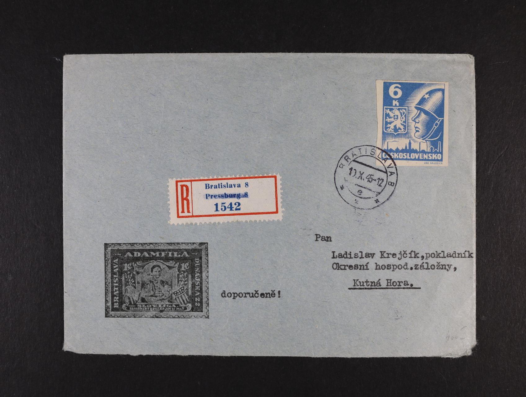 firemní R-dopis do Kutné Hory frank. zn. č. 356, pod. raz. BRATISLAVA 10.10.45 + přích. raz.