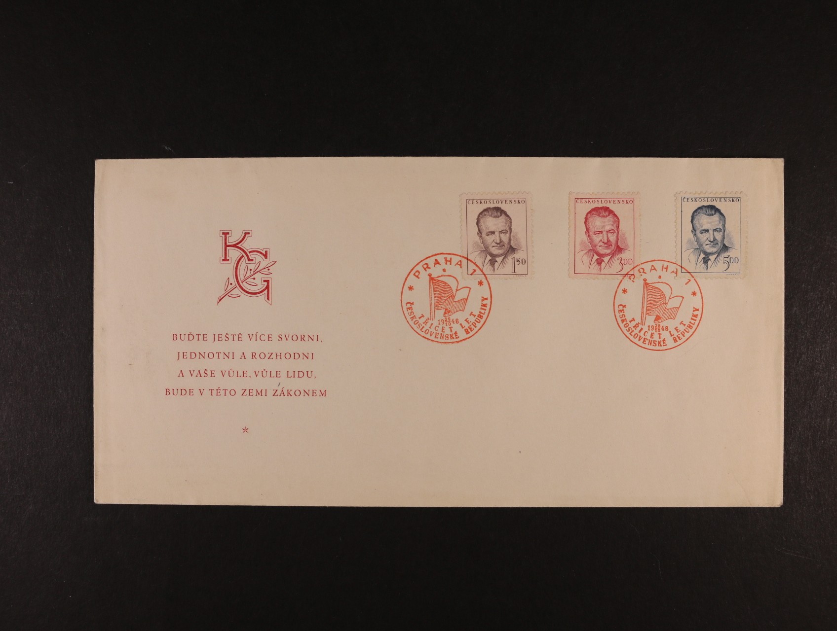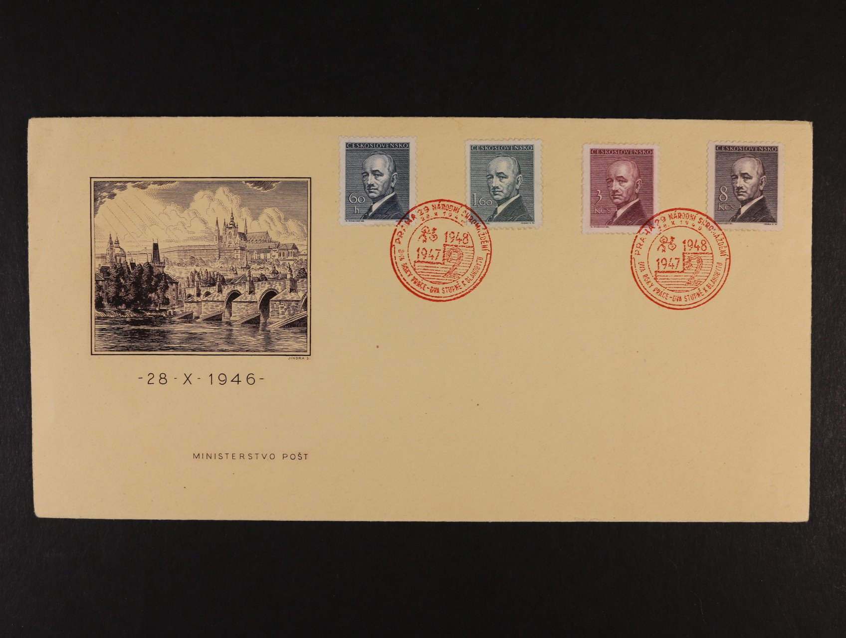 ministerská obálka FDC M 1/47 bez nalepené známky, na zadní str. přítisk GENERÁLNÍ ŘEDITEL POŠT, lux. kvalita, kat. neuvádí, kat. cena se zn. 5000 Kč