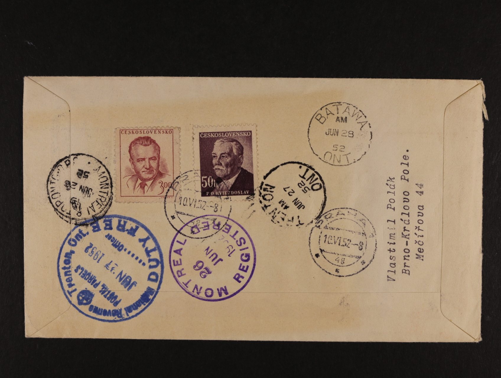 FDC se zn. č. 661 - 3, dofrank. a RECO do Kanady, DR PRAHA 1 10.6.52 + průch, přích. a celní raz., zajímavé