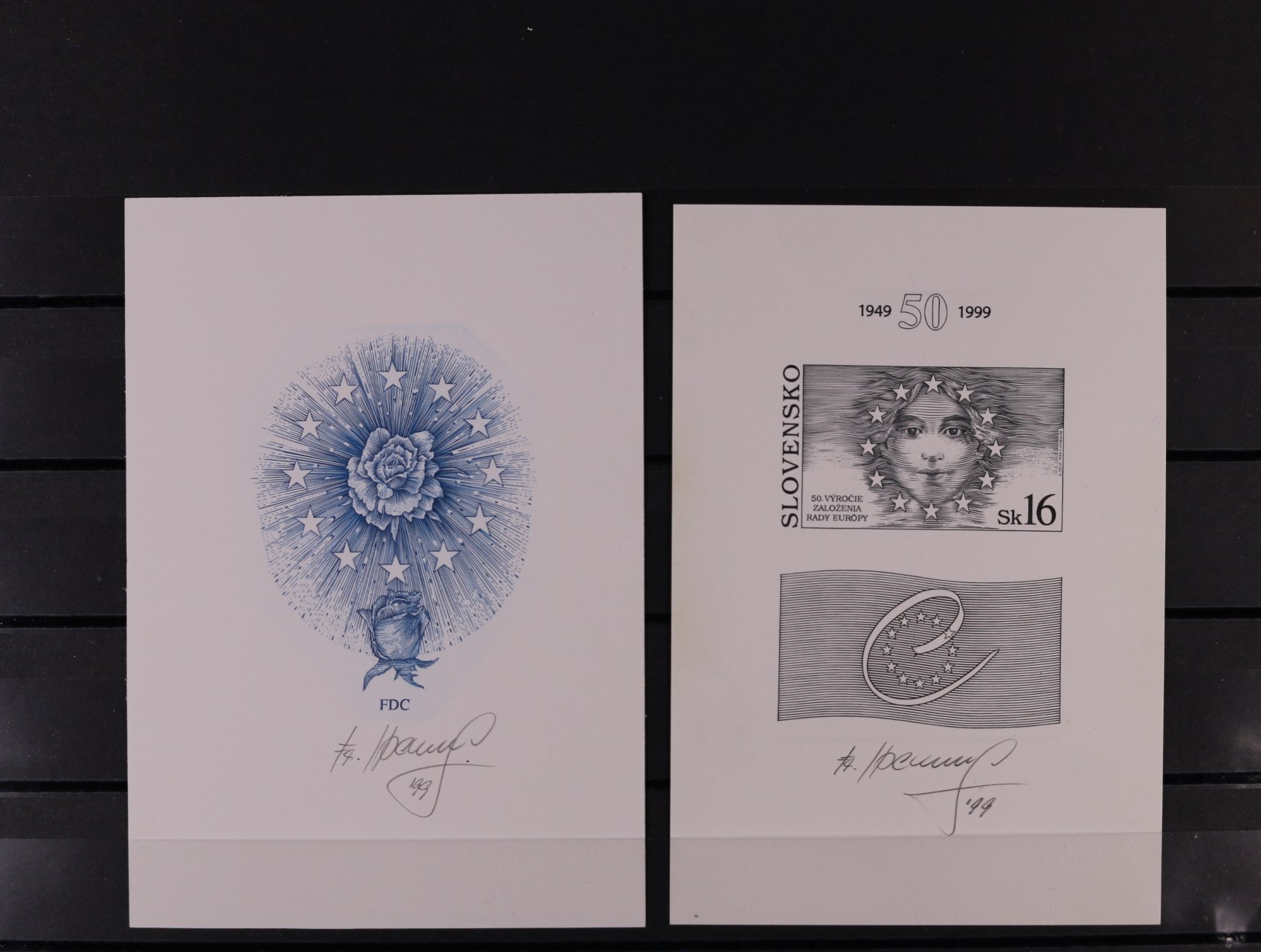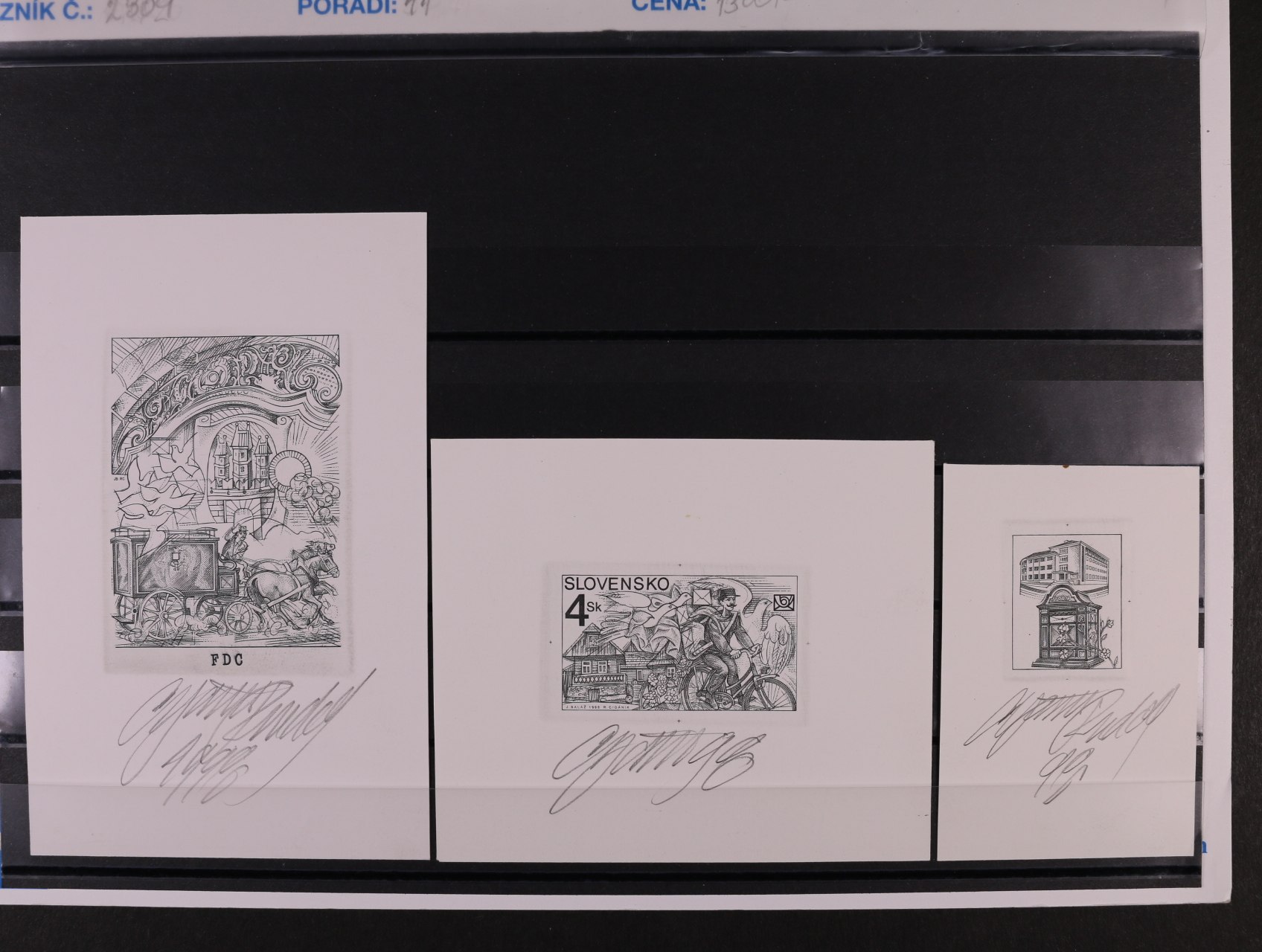 662 otisk orig. rytiny aršíku č. 179 v černé barvě +otisk rytiny na FDC v barvě modré na kouscích kříd. papíru, sign. Horniak 1200
