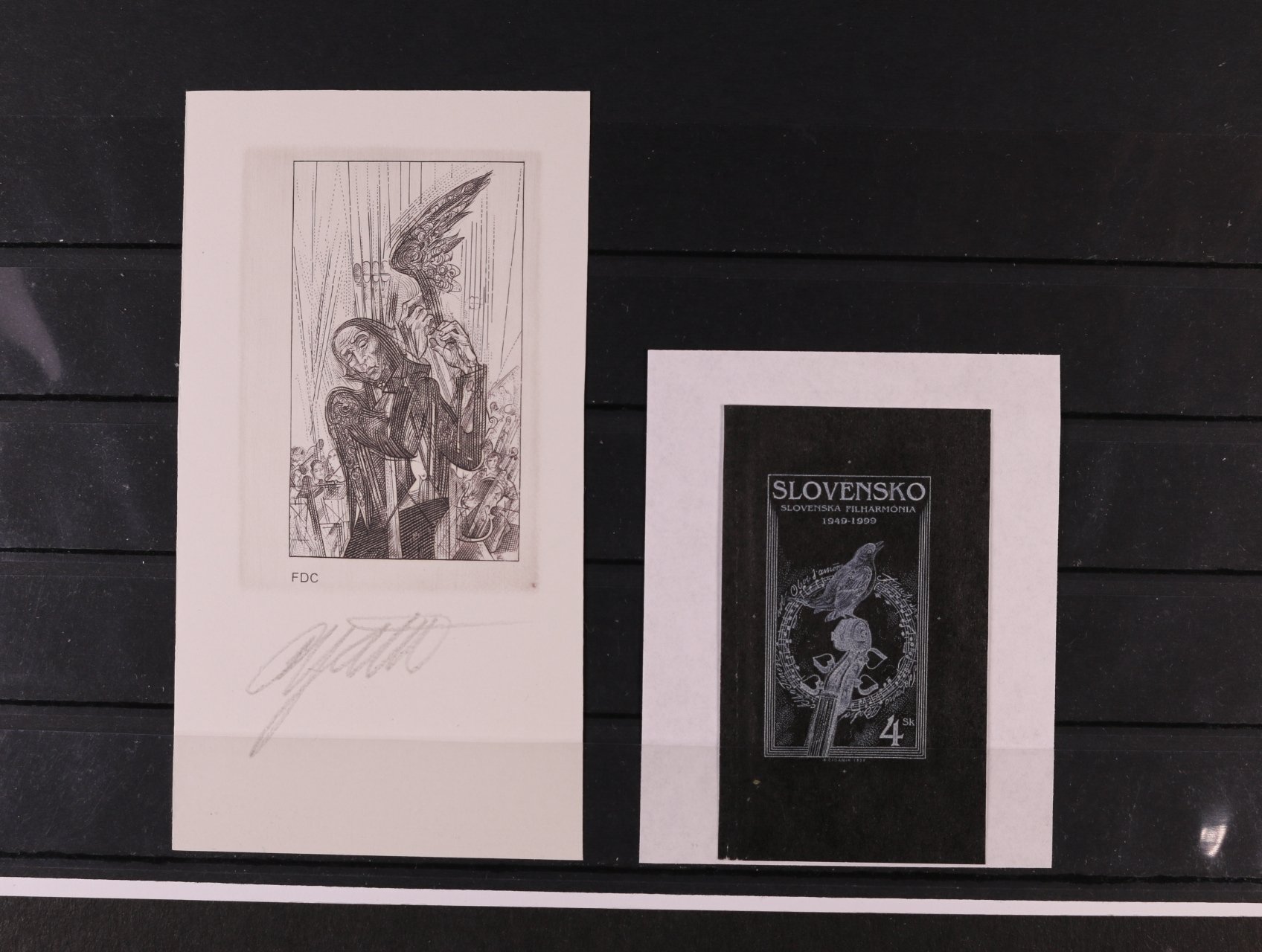 663 otisk orig. rytiny zn. č. 181 stříbrnou barvou na černém papíře + otisk rytiny k FDC v barvě hnědé na kousku karton. papíru, sign. R. Cigánik 1300