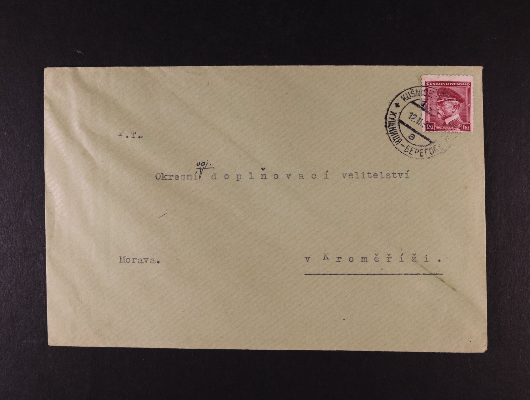 666 Podkarp. Rus - dopis na okr. voj doplňovací velitelství v Kroměříži s pod. raz. VLP KUŠNICE - BEREGOVO 12.2.38 200
