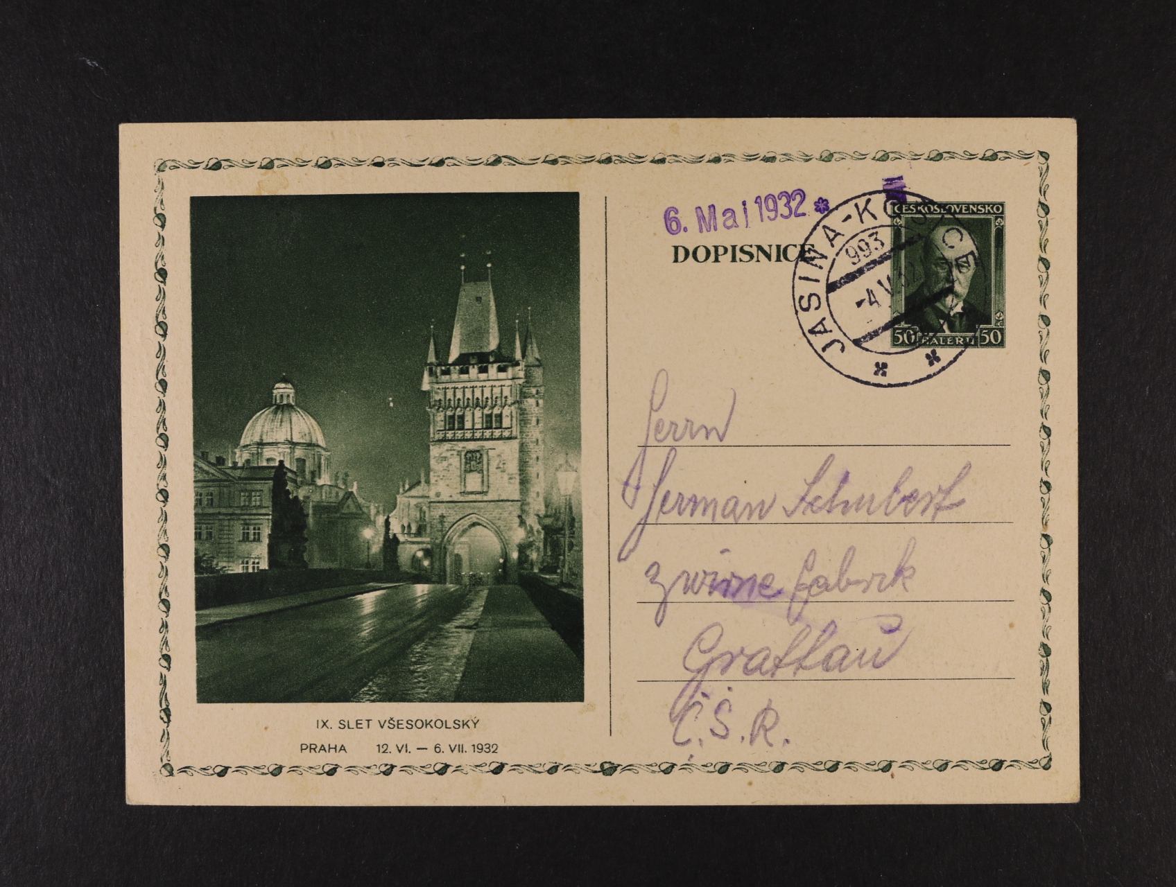 668 CDV s natištěnou zn. 50h T.G.M. "IX. SLET VŠESOKOLSKÝ 1932, s pod. raz. VLP 993 Jasiňa - Košice, velmi dobrá kvalita 200