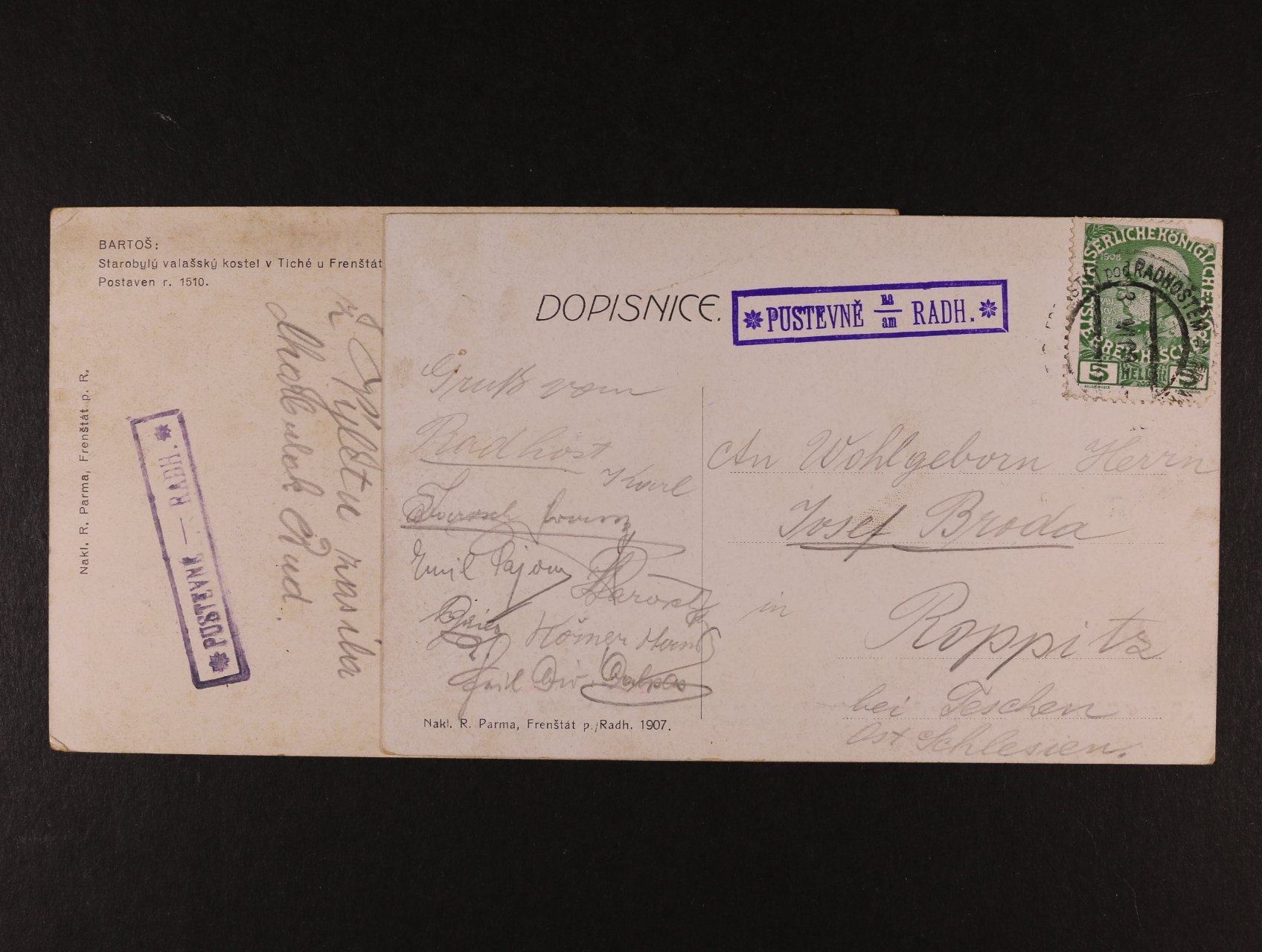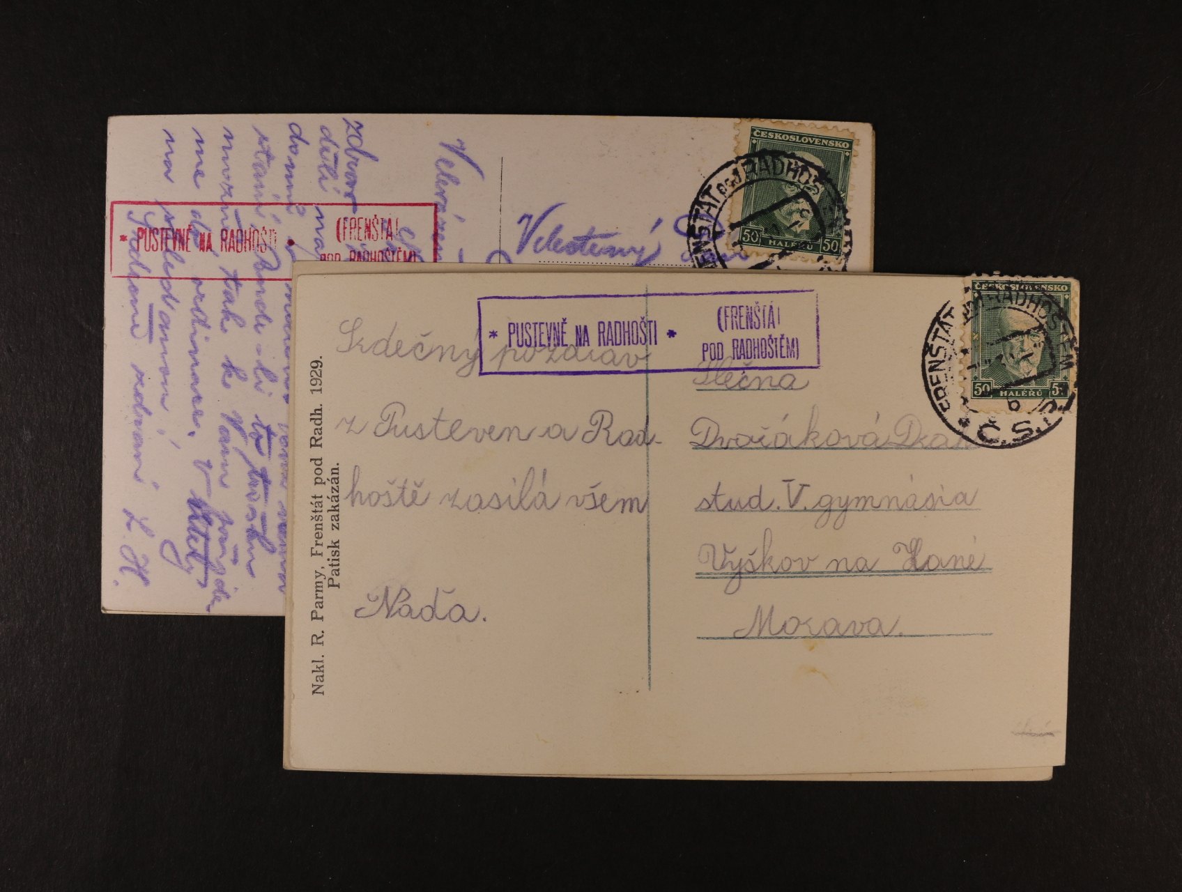 669 ČSR I - celistvost s rámeč. raz. PUSTEVNĚ NA/AM RADH., dtto s vylomeným NA/AM, vzácné 400