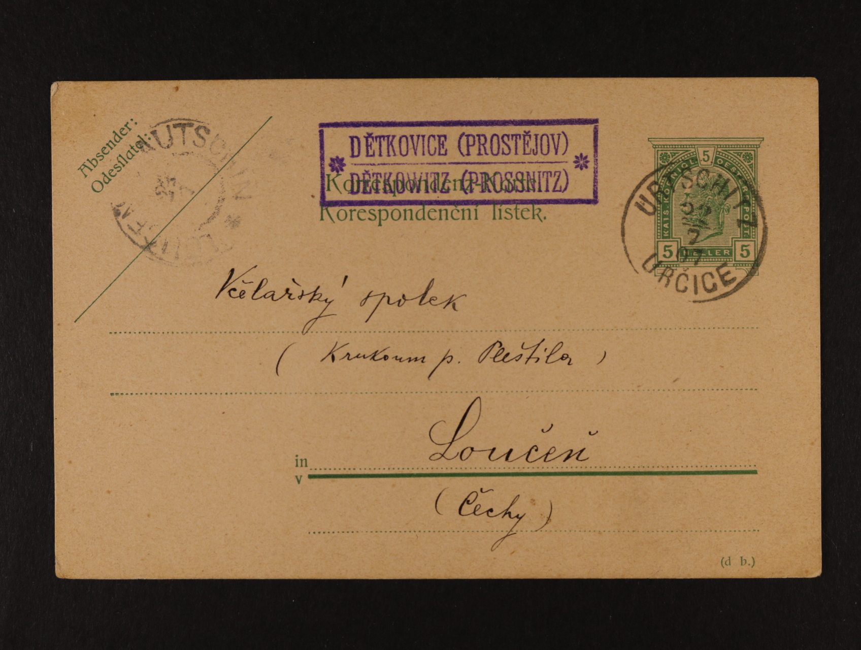 674 rakouský KL s pod. raz. URTSCHITZ 22.7.07 + fialové rámečkové dvojjazyčné raz. poštovny DĚTKOVICE (Prostějov) + přích. raz., lux. kvalita 200