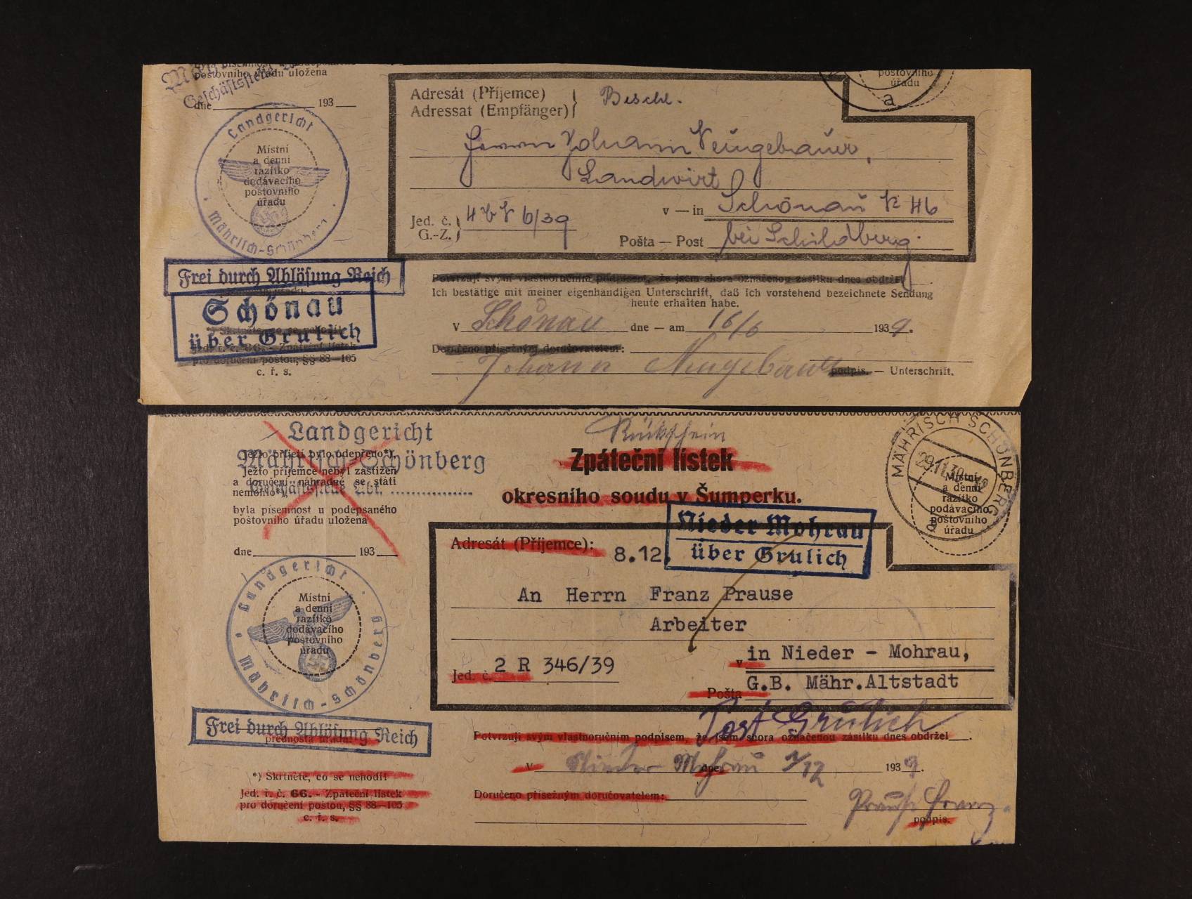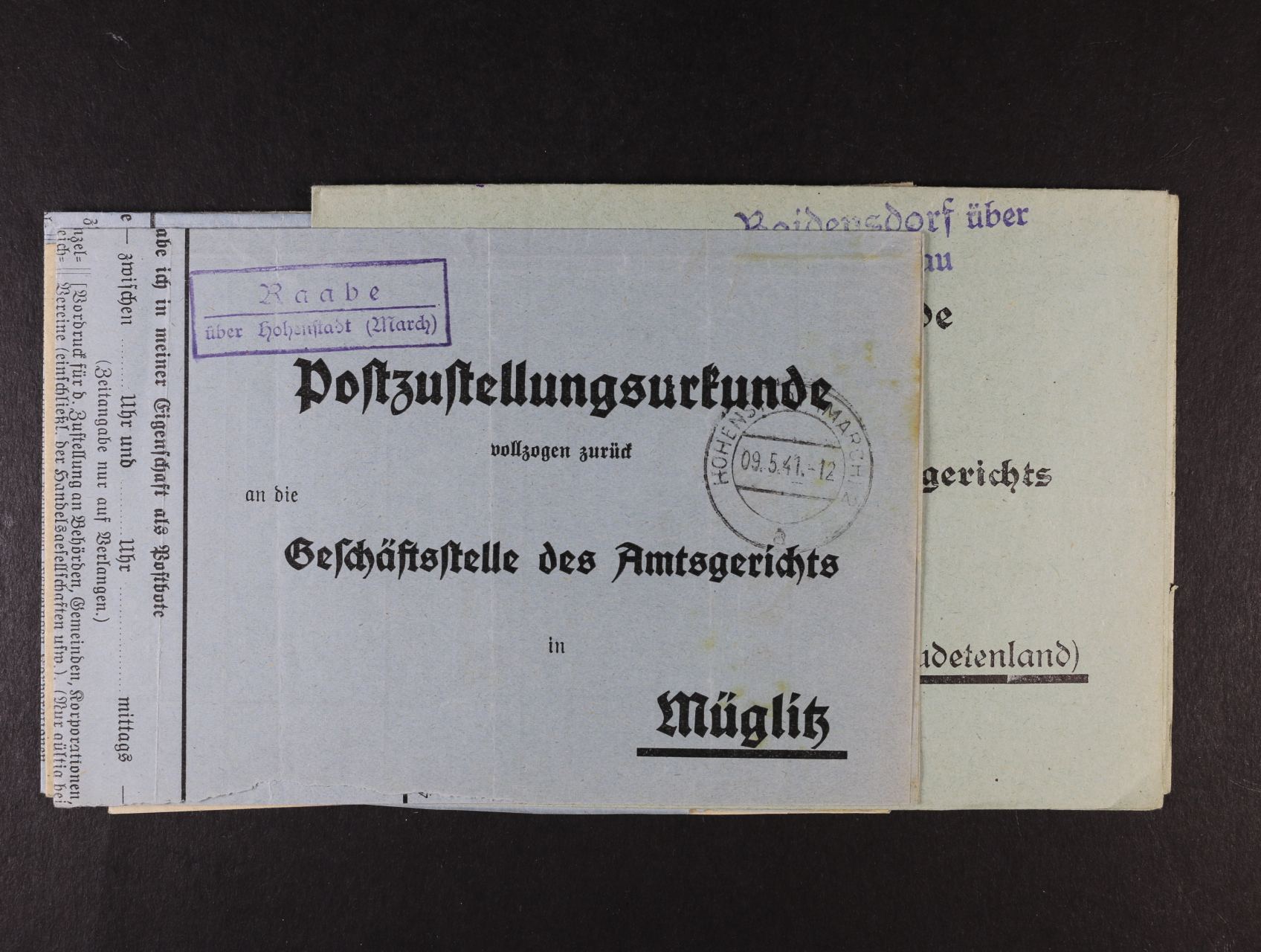 676 Sudety - sestava 7 ks formuláře Postzustellungsurkunde s různými raz. poštoven, kat. Gebauer č. 0059 (Bohdanovice), 0367 (Hrabová), 0513 (Kralovec), 0657, 0852, 1388 500