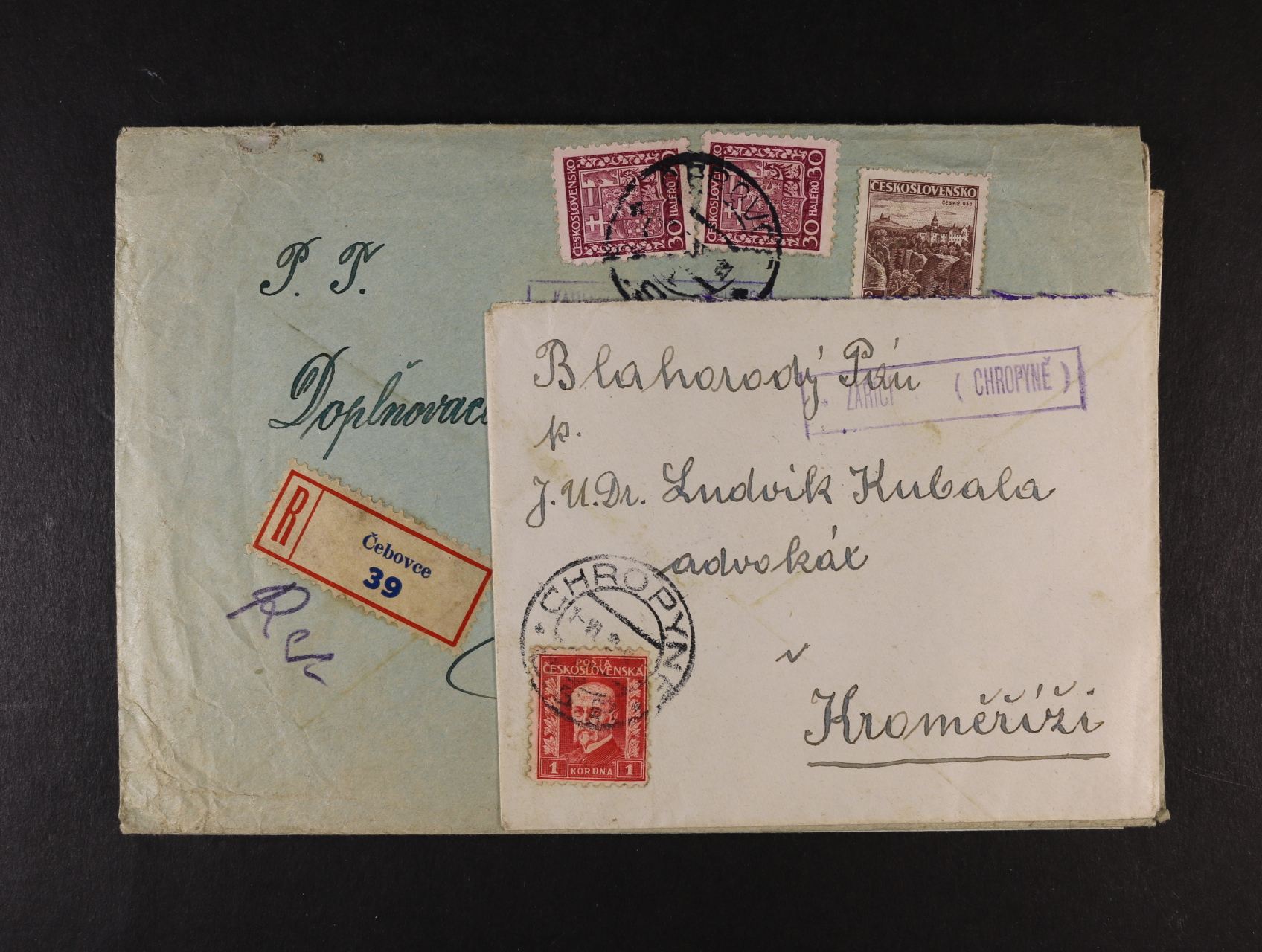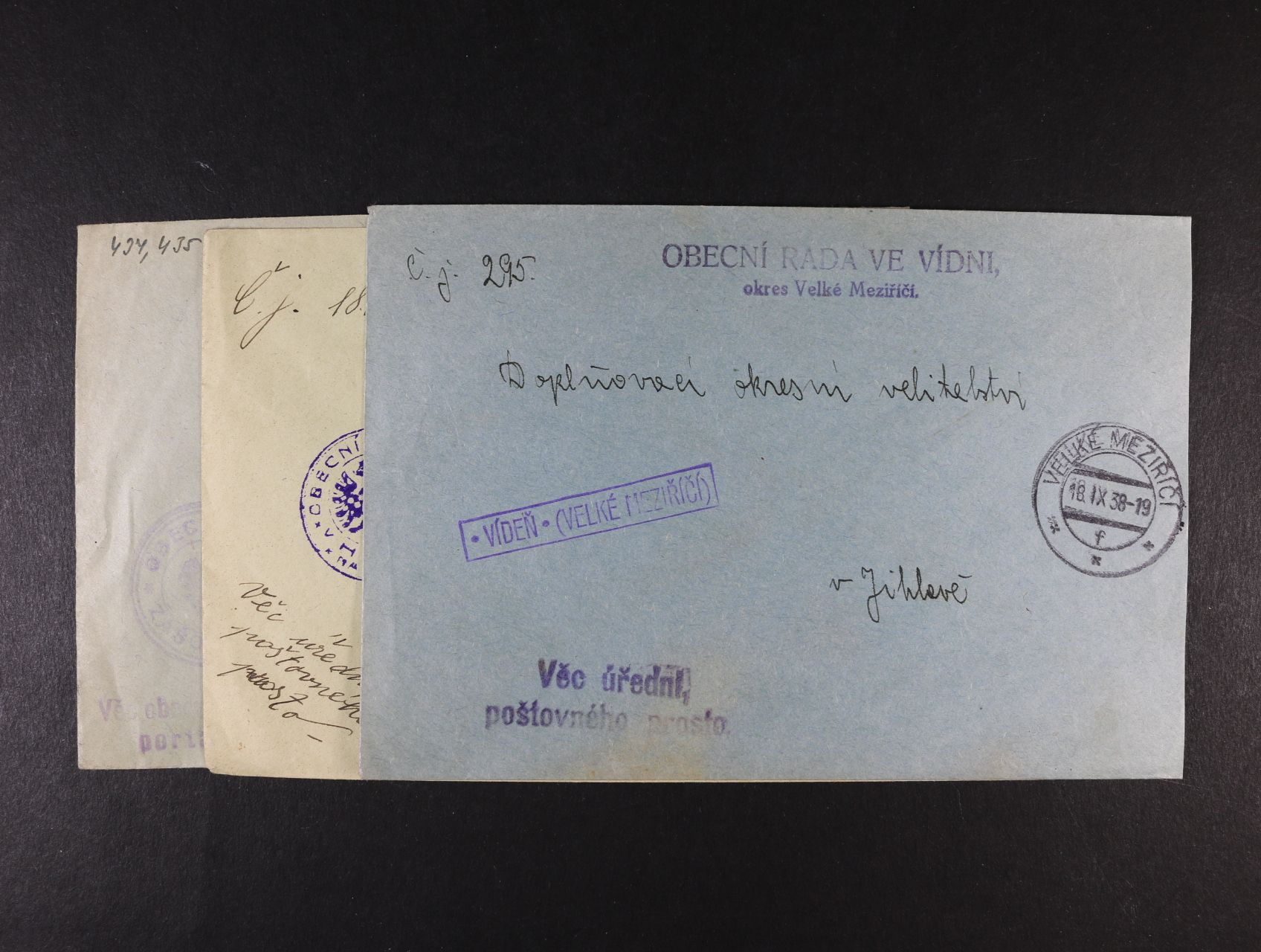 678 sestava 8 ks služebních celistvostí z období ČSR I s raz. poštoven, mj. VÍDEŇ (Velké Mez.), HLADOV, ZAŠOVICE, VELEŠOVICE, DOLNÍ HEŘMANICE, LOUČKA 200