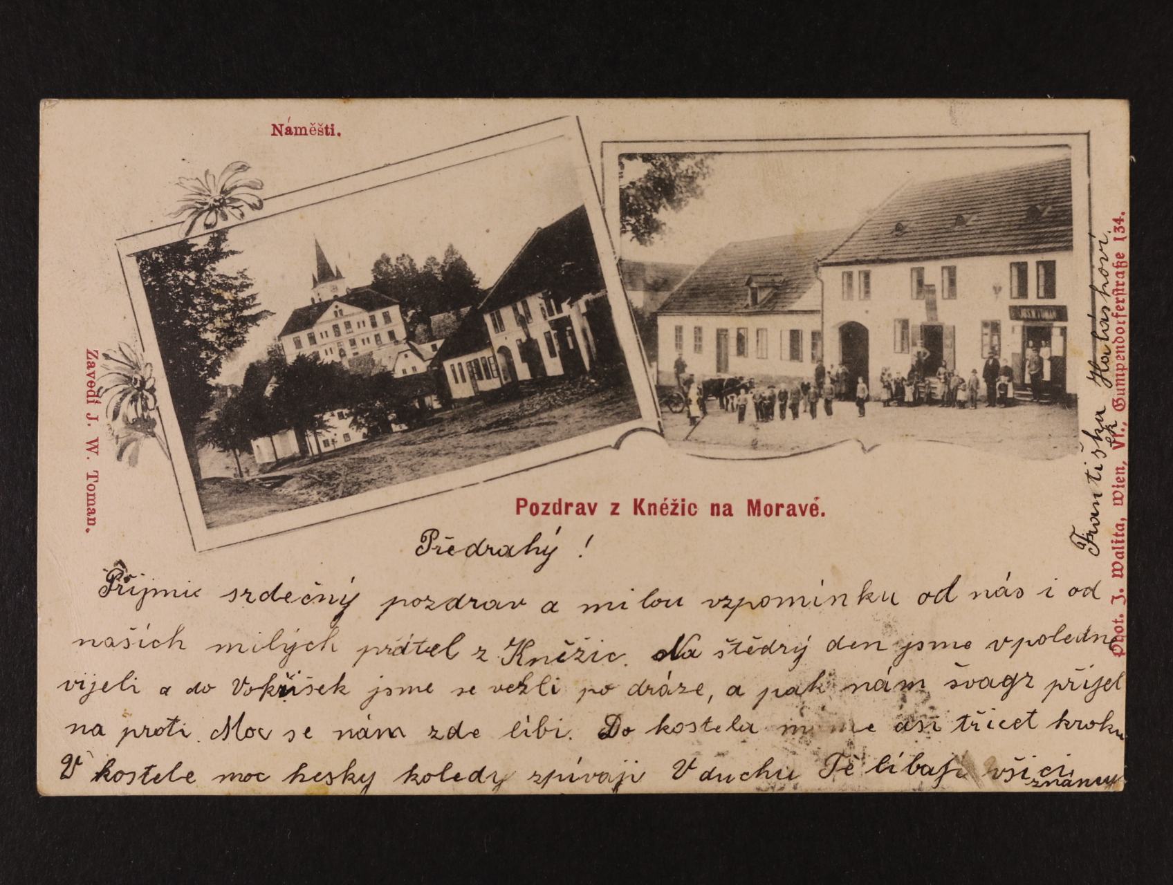 Kněžice na Moravě, okr. Jihlava - dvoubarevná dvouokénková pohlednice, použitá 1903