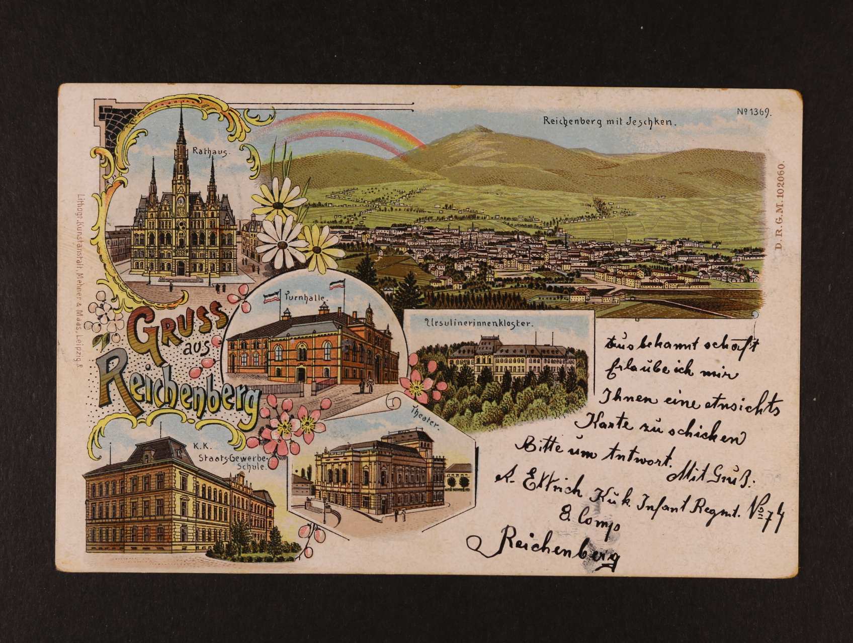 Liberec - bar. litograf. koláž, dl. adresa, použitá 1899