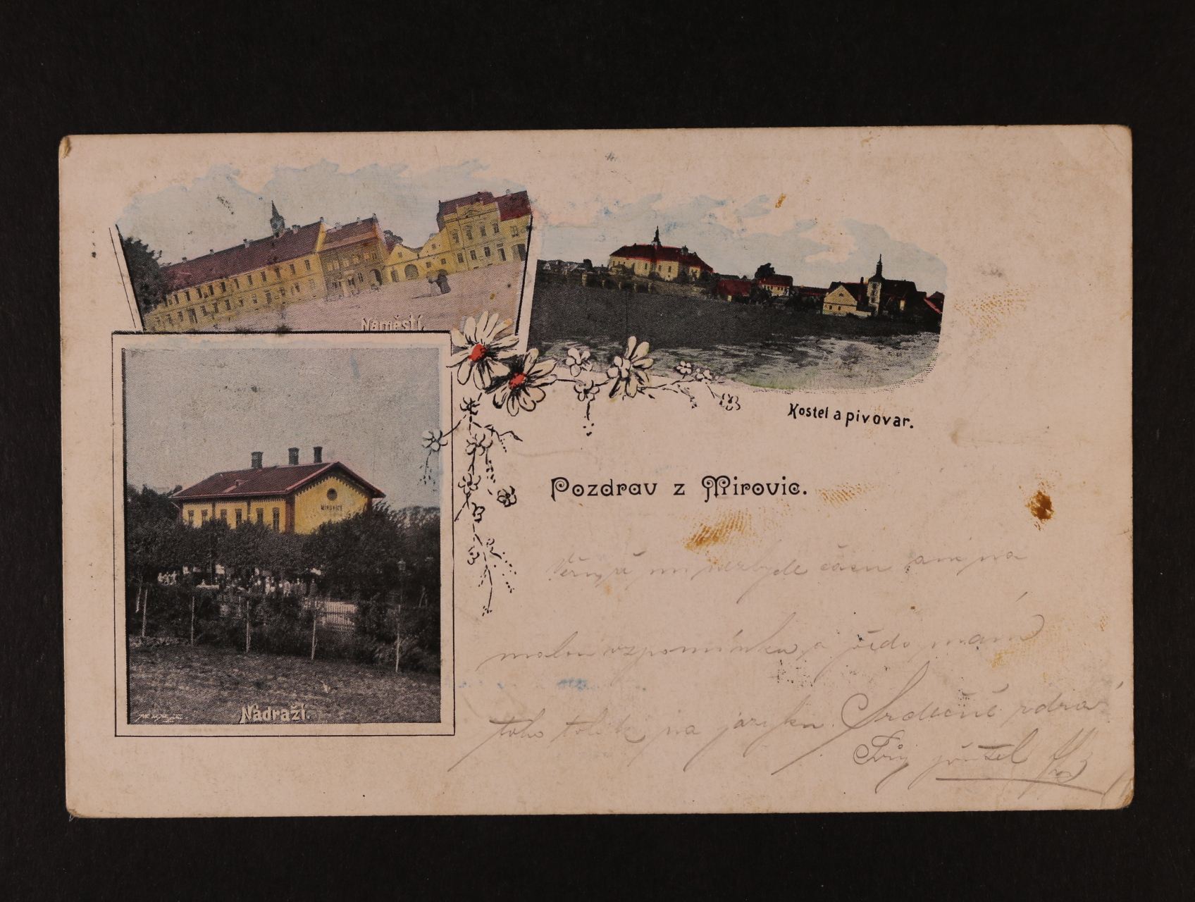 Mirovice, okr. Písek - barevná tříokénková pohlednice, náměstí, nádraží, kostel a pivovar, použitá, dlouhá adresa