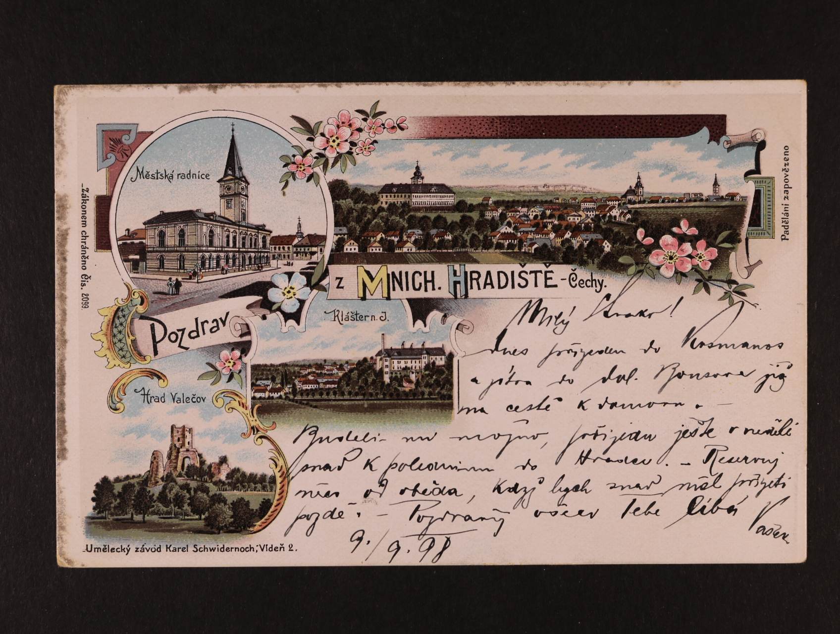 Mnichovo Hradiště - bar. litograf. koláž, dl. adresa, použitá 1898