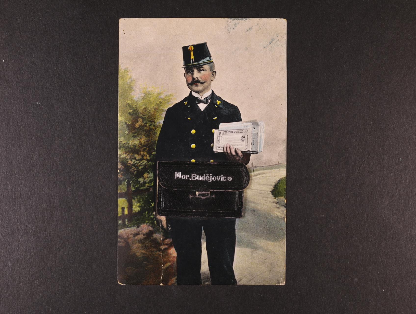 Moravské Budějovice - bar. pohlednice pošťáka s taškou a vloženým leporelem, použitá 1908, ve spodní části lom