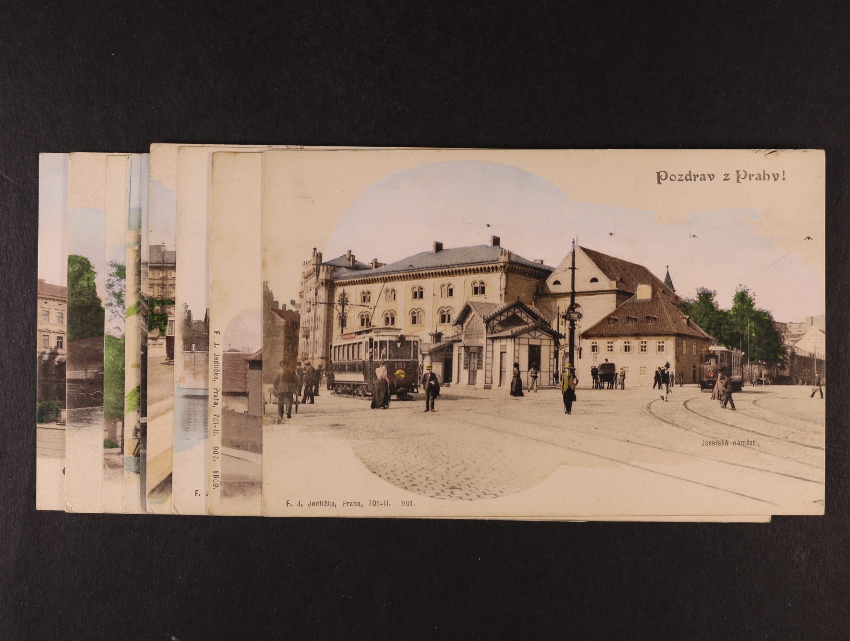 747 Praha, 21 ks. bar. pohlednic z jubilejní výstavy v r. 1908 v původní krabičce, neprošlé, dlouhá adresa, 600
