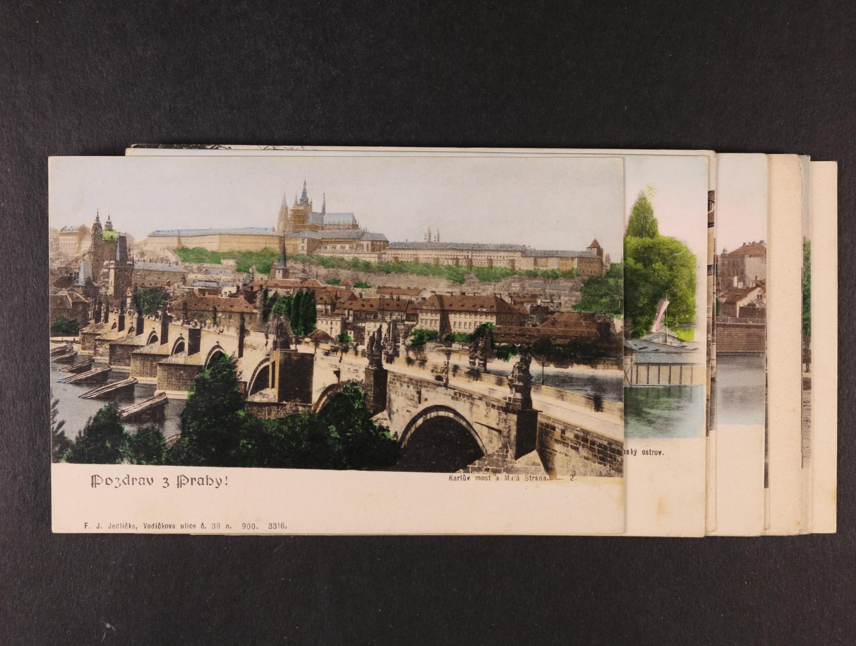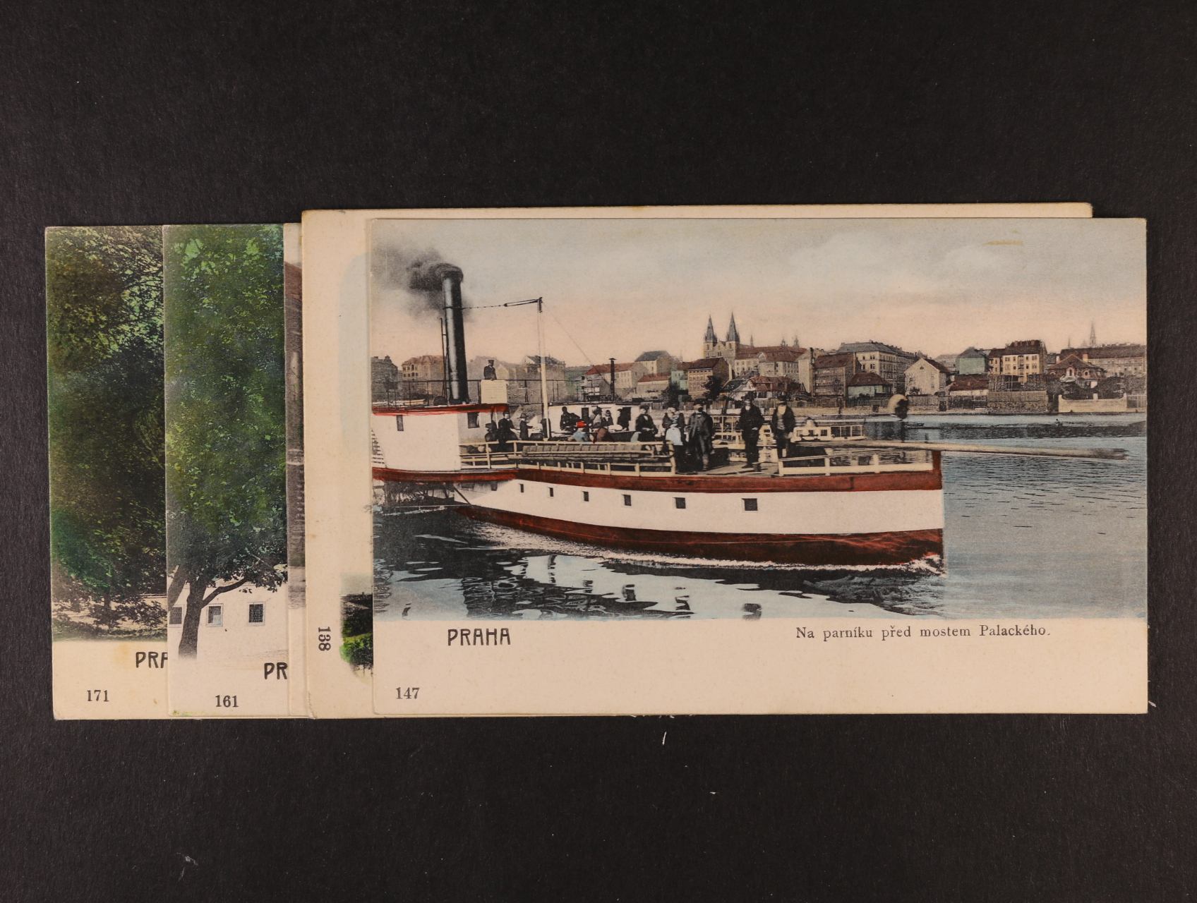 750 Praha, 7 ks. bar. pohlednic, neprošlé, dlouhá adresa 500
