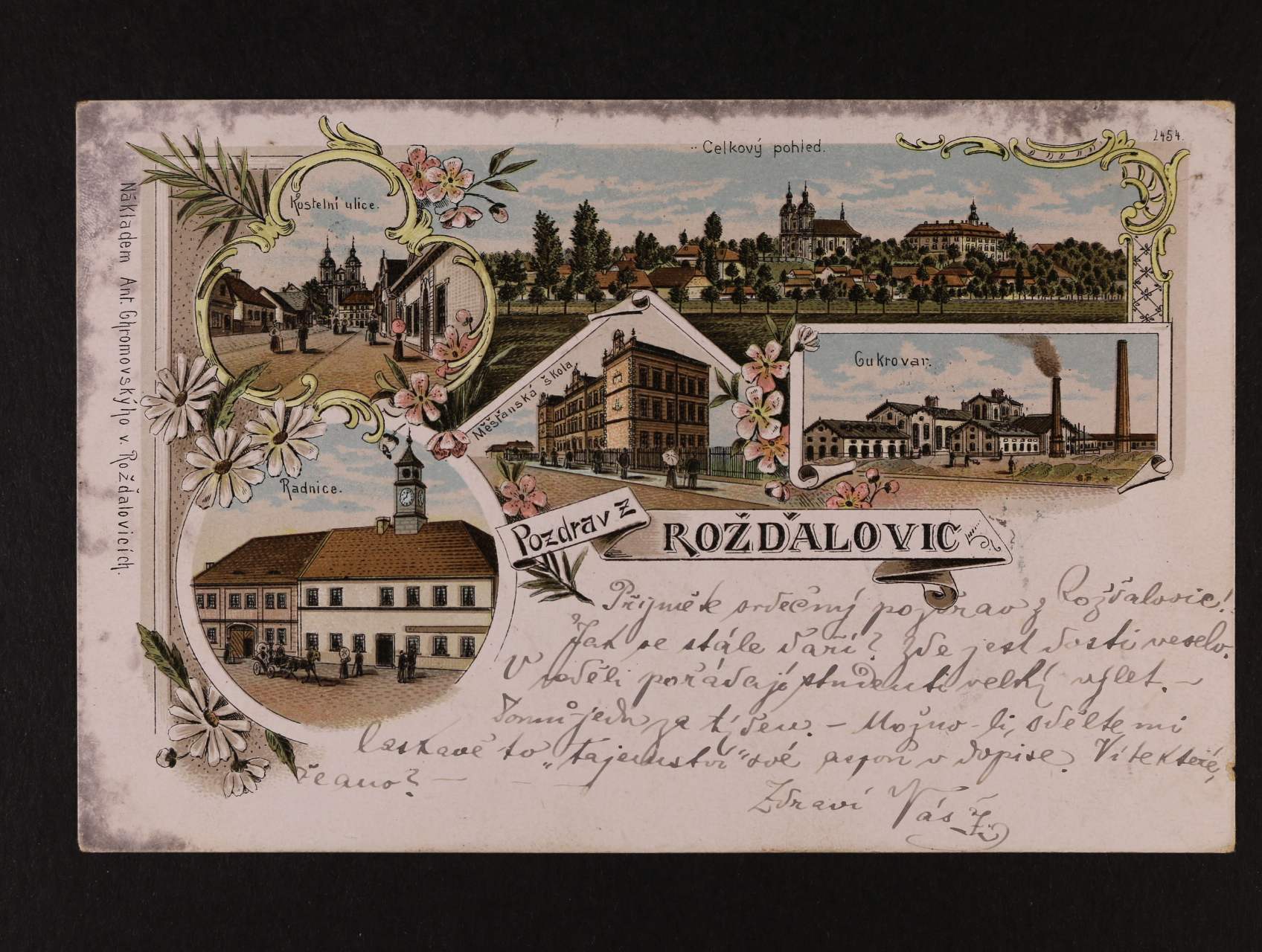759 Rožďálovice - bar. litograf. koláž, dl. adresa, použitá 1899 200