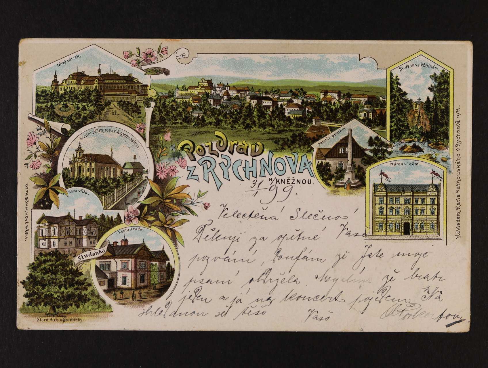 760 Rychnov nad Kněžnou - bar. litograf. koláž, dl. adresa, použitá 1899 200