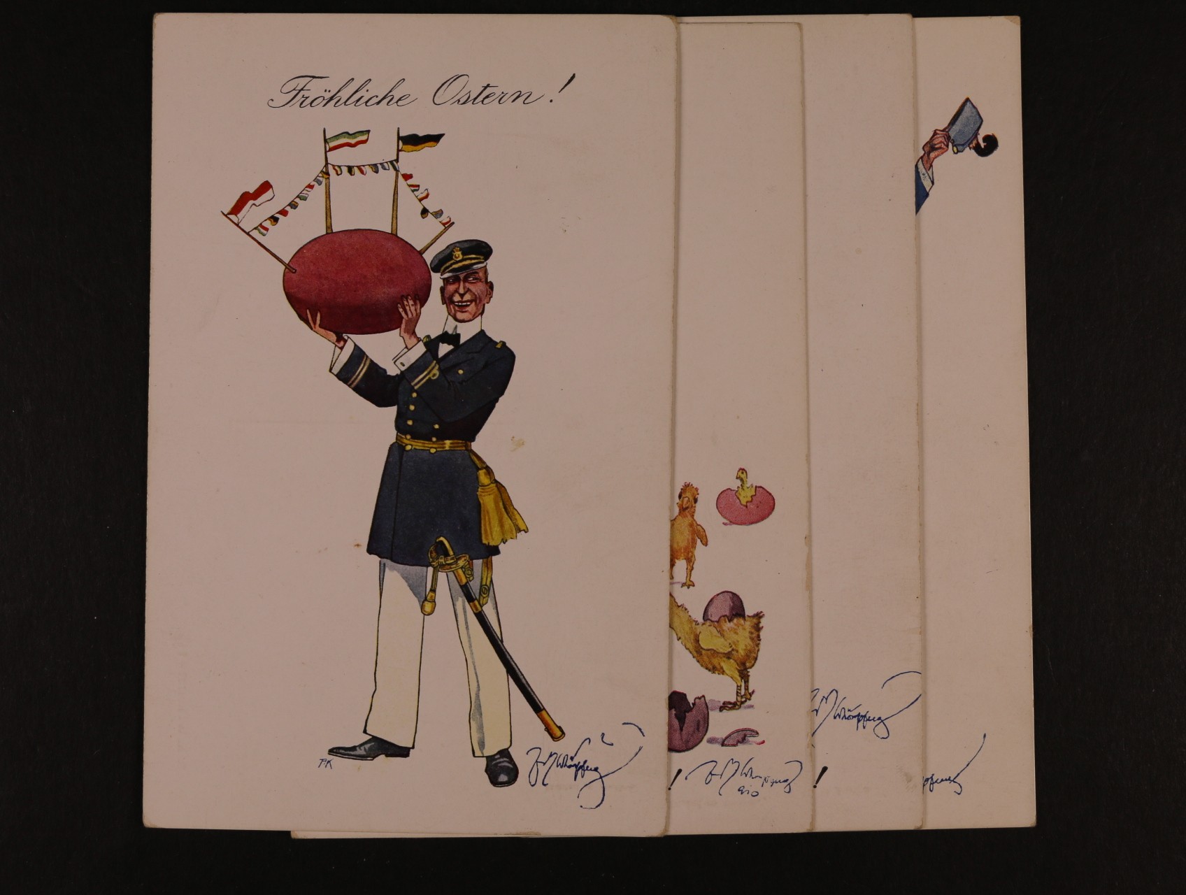 Přání velikonoce - sestava 4 ks bar. pohlednic s vojenskými náměty, nepoužité