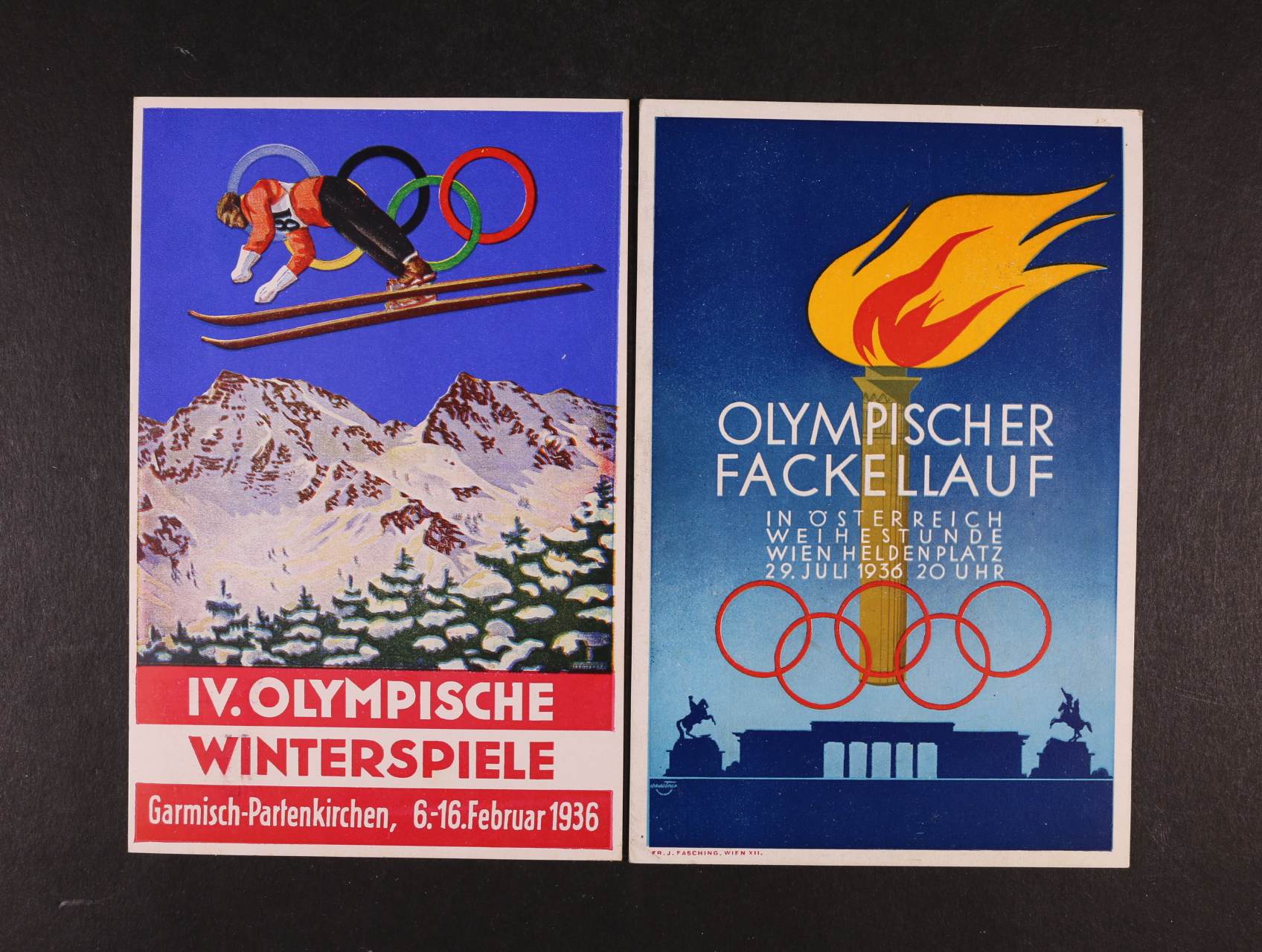 Sport - 2 bar. pohlednice vydané k olympiádě 1936, Garmisch - IV Olympische Winterspiele, resp. Olympischer Fackellauf Wien-Heldenplatz, bezvadné