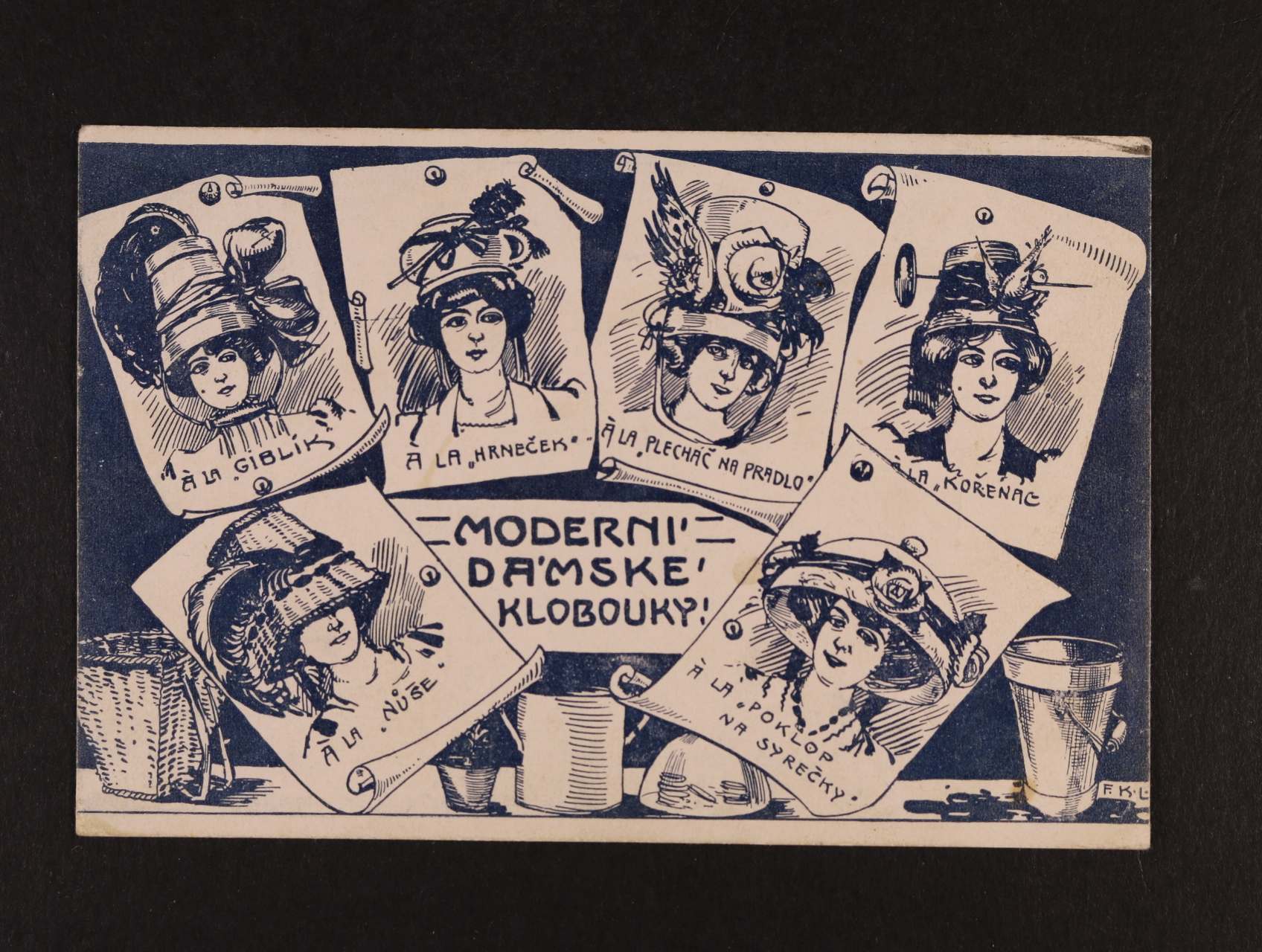 Šváb J. "Moderní dámské klobouky" - jednobar. pohlednice, použitá 1909, dobrá kvalita