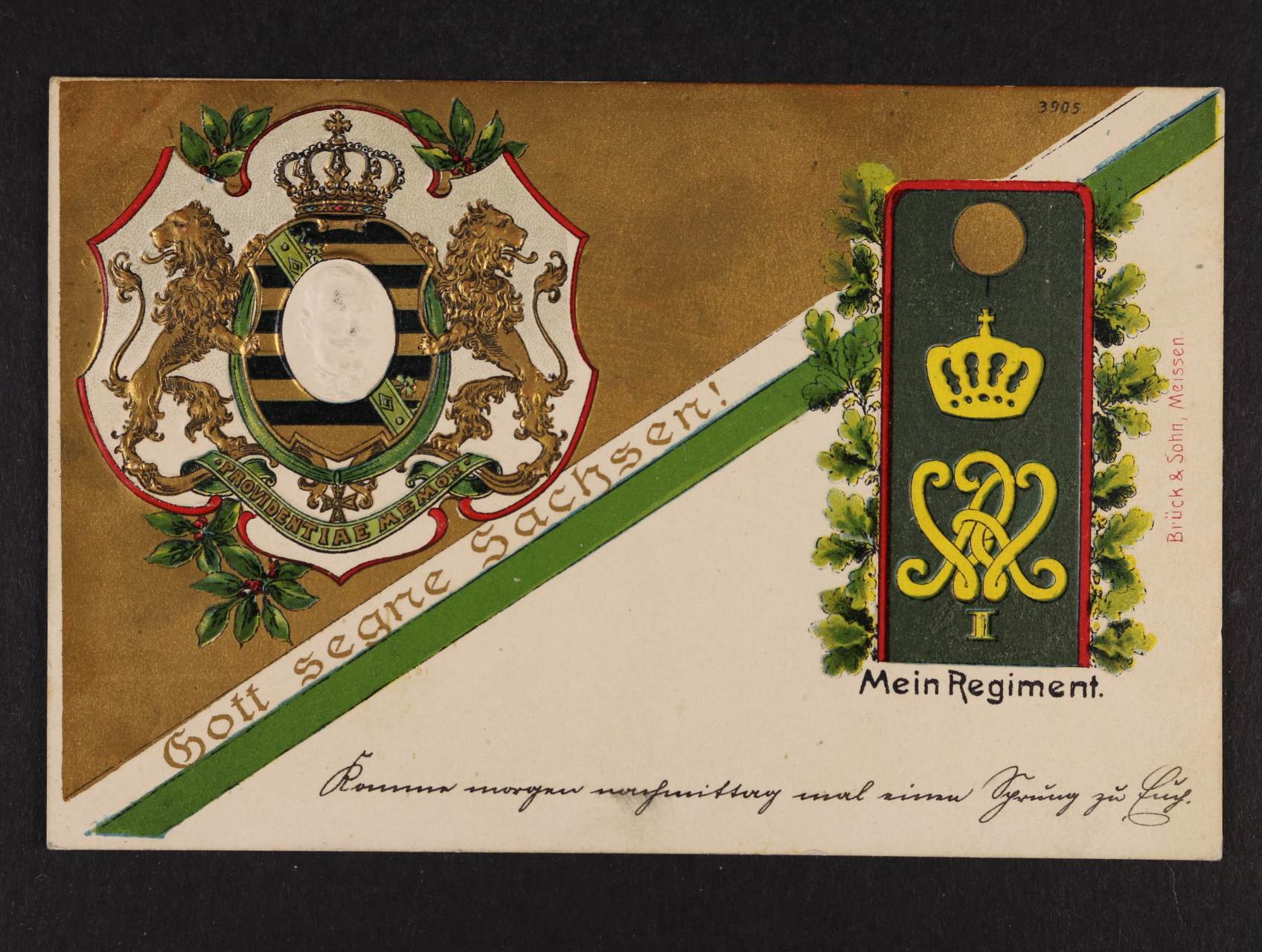 Vojenské - bar. reliéfní litografie "Gott segne Sachsen!" - Mein Regiment
