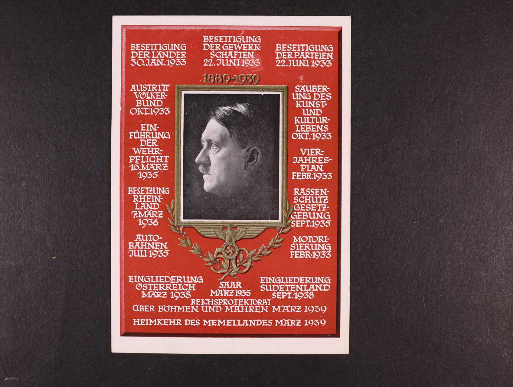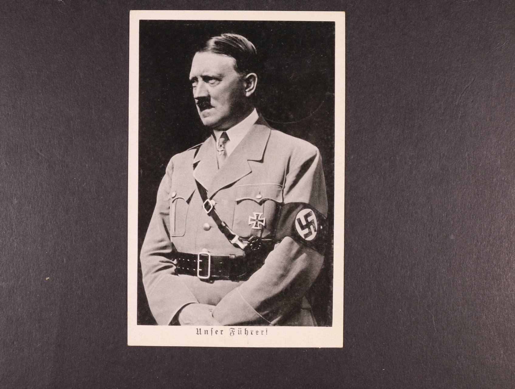 fotopohlednice s portrétem A. H., nepoužitá, na zadní str. pam. raz. PRAHA 1 20.4.39 50. VÝROČÍ NAROZENIN VŮDCE